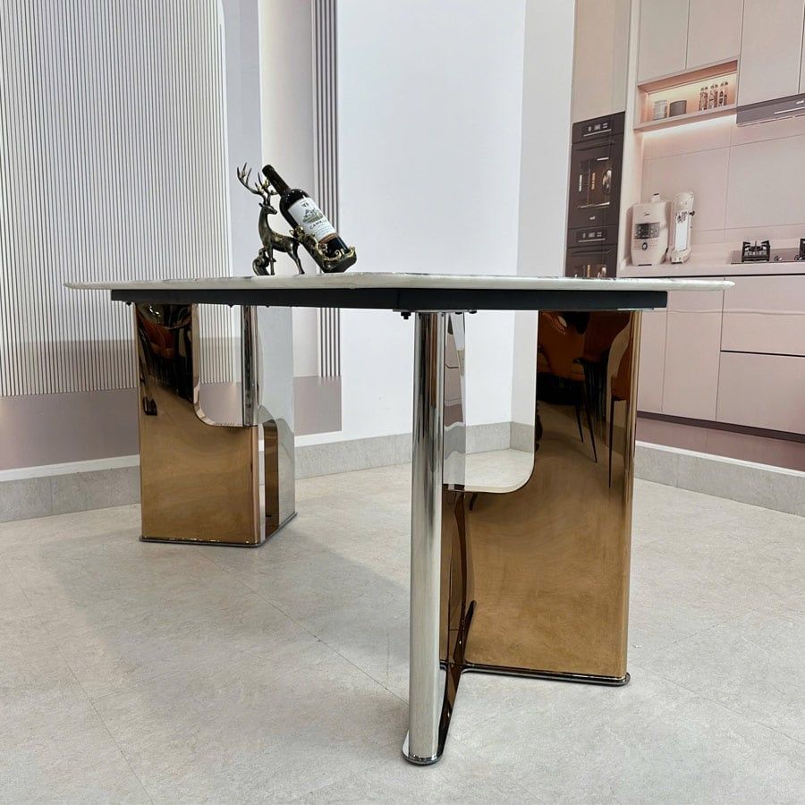 Chất liệu bàn: Mặt bàn đá thạch anh tinh thể cao cấp, chân bàn inox cao cấp mạ vàng sáng bóng.