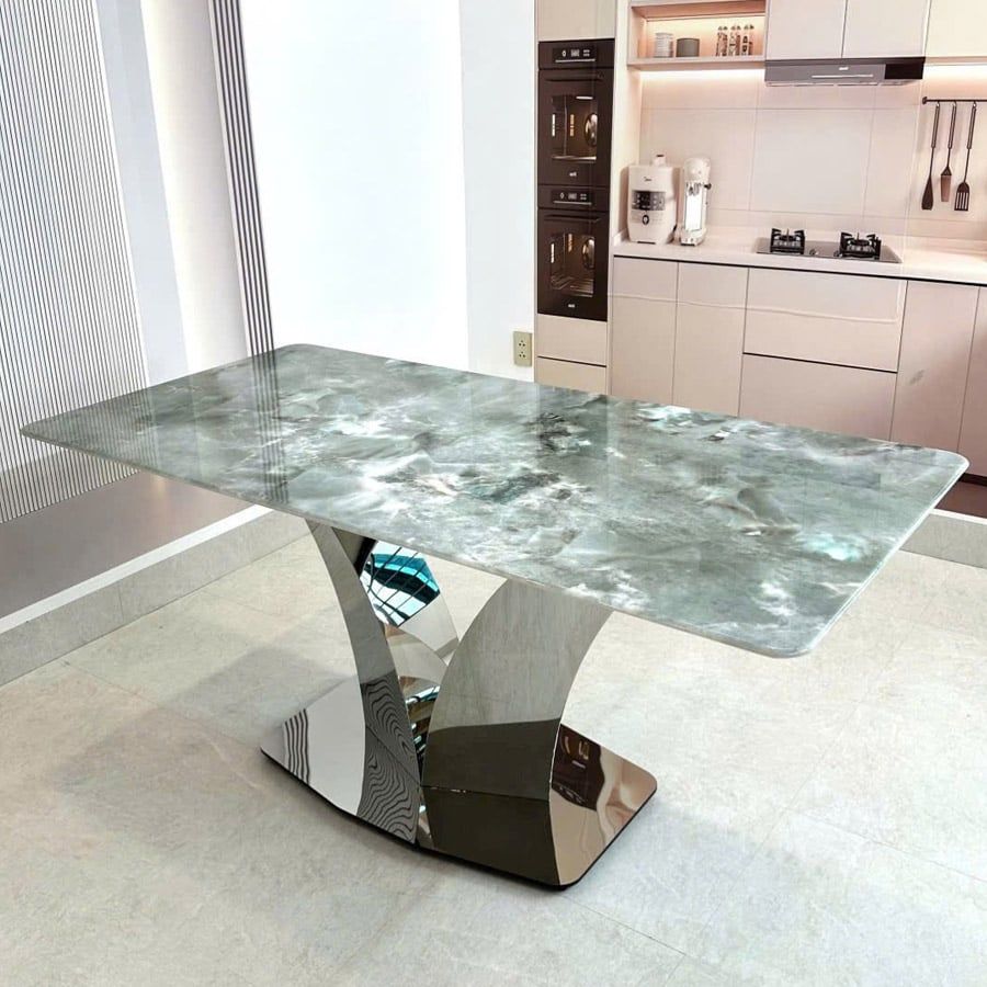 - Bàn ăn HAK81: Mặt đá thạch anh chống trầy. Chân inox cao cấp sáng bóng.