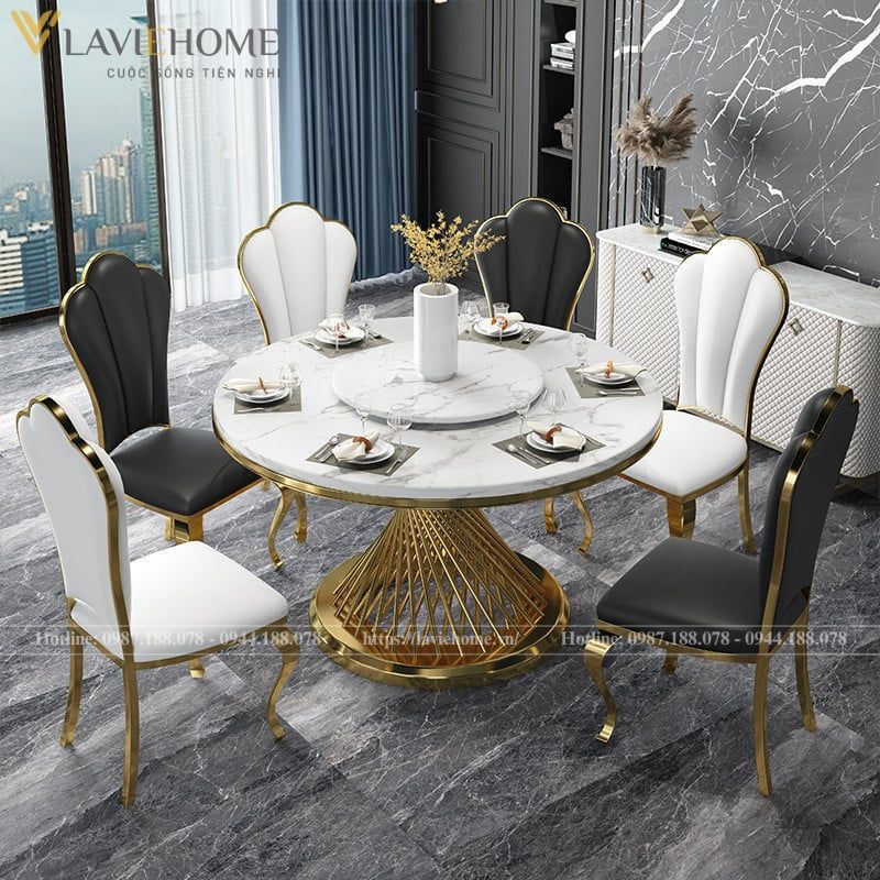 - Chân ghế mạ vàng vững chắc: Kết cấu bền vững, chịu lực tốt, tăng thêm nét đẹp đẳng cấp cho phòng ăn.