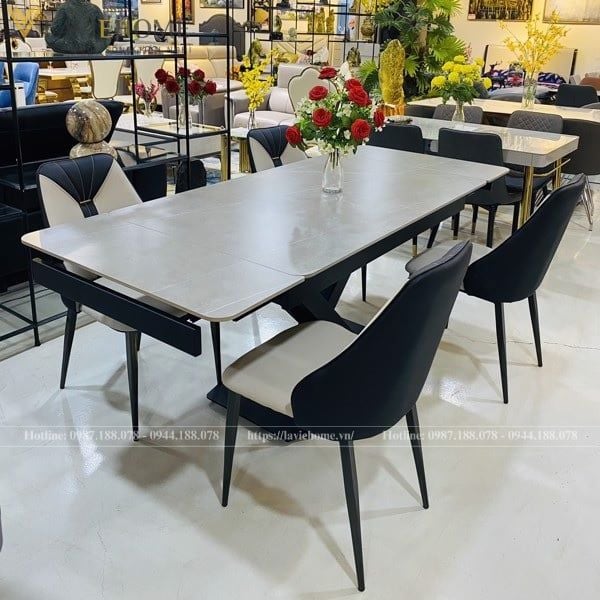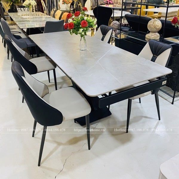 Bộ bàn ăn mặt đá Oracle kết hợp với ghế Caven là lựa chọn hoàn hảo cho không gian phòng ăn hiện đại. Mặt bàn đá Ceramic cao cấp có khả năng chống trầy xước, chịu nhiệt tốt và dễ dàng vệ sinh. Bàn có thiết kế mở rộng linh hoạt, giúp tiết kiệm không gian và phù hợp với nhiều nhu cầu sử dụng.