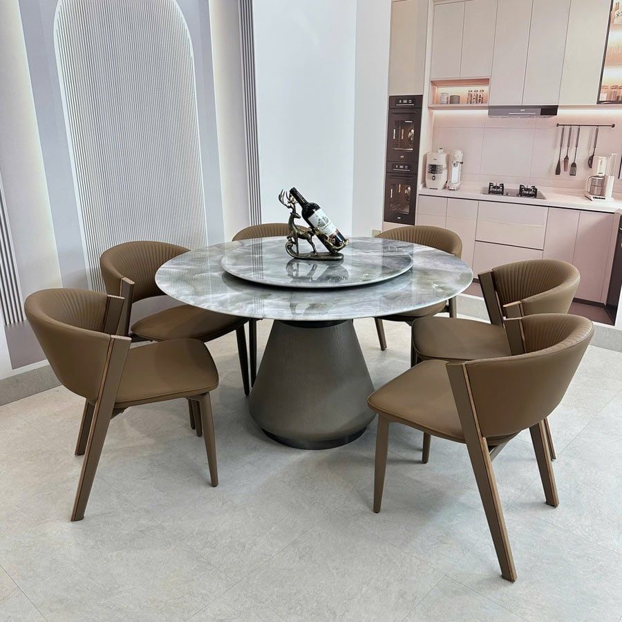 Bộ bàn ăn tròn mặt đá HAK39 + Ghế Ariston HAG55 mang lại sự sang trọng và tinh tế cho phòng ăn hiện đại. Với thiết kế mặt bàn tròn cùng mâm xoay tiện lợi, bàn giúp tối ưu trải nghiệm dùng bữa, thuận tiện cho cả gia đình. Ghế Ariston HAG55 với đệm da NANO chống mèo cào và khung thép mạ titan chắc chắn, tạo cảm giác êm ái và bền bỉ theo thời gian.