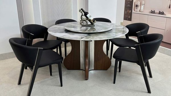 Bộ bàn ăn tròn mặt đá HAK84 kết hợp ghế ăn Ariston HAG55 là lựa chọn hoàn hảo cho những ai yêu thích phong cách hiện đại và sang trọng. Thiết kế bàn tròn giúp các thành viên dễ dàng trò chuyện, tăng tính gắn kết trong mỗi bữa ăn.