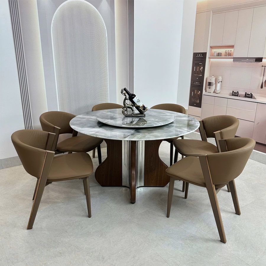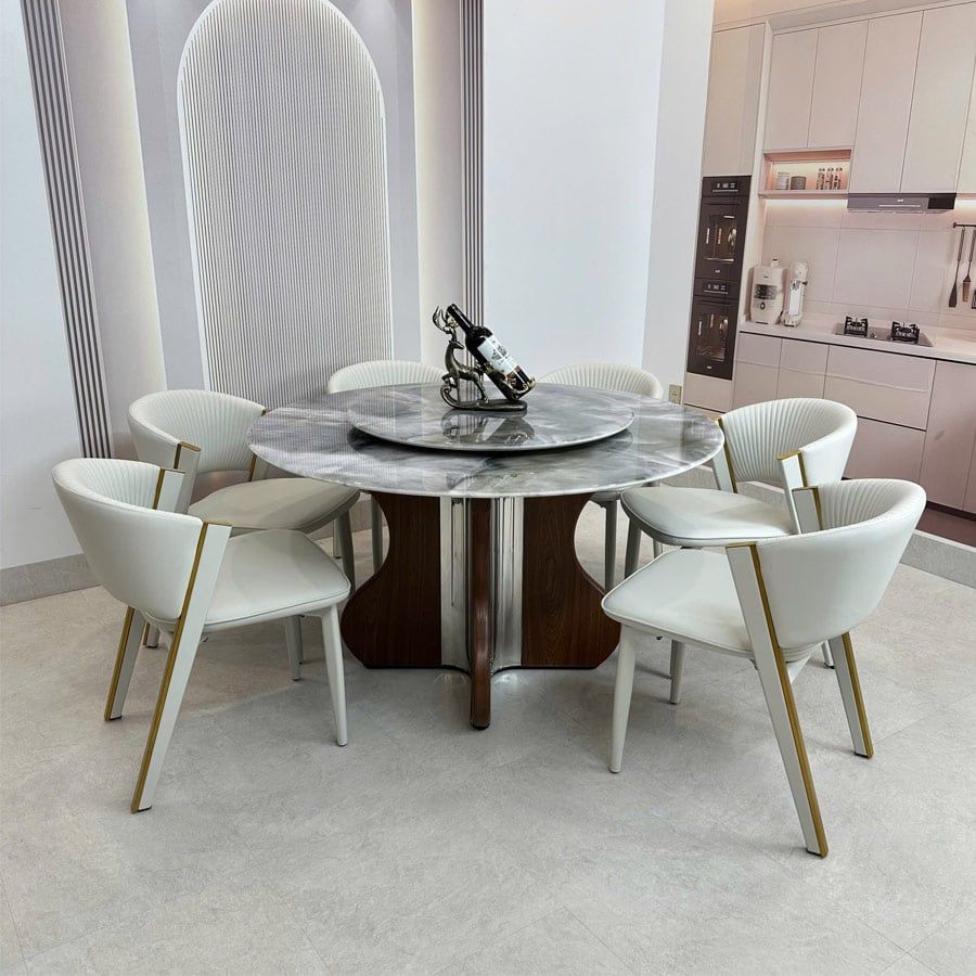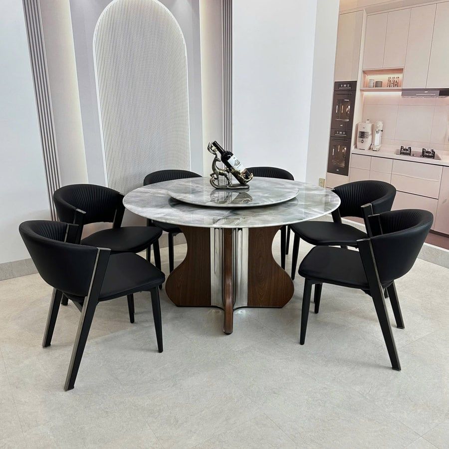 Bộ bàn ăn tròn mặt đá HAK84 + ghế ăn Ariston HAG55 là sự lựa chọn hoàn hảo cho những gia chủ yêu thích sự tinh tế và sang trọng. Với mặt bàn đá cao cấp, khung bàn chắc chắn, ghế da êm ái – đây là điểm nhấn tuyệt vời giúp không gian phòng ăn trở nên ấm cúng và đẳng cấp hơn bao giờ hết.