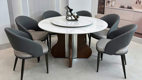 Bộ bàn ăn tròn mặt đá HAK84 + ghế ăn VNC89 là sự kết hợp hoàn hảo giữa tính thẩm mỹ và công năng, mang đến điểm nhấn sang trọng cho mọi không gian phòng ăn. Mặt bàn đá thạch anh tinh thể cao cấp với vân đá tự nhiên tinh xảo, tôn lên nét hiện đại và đẳng cấp. Thiết kế bàn tròn giúp kết nối mọi thành viên trong gia đình, tạo nên không khí ấm cúng và gần gũi.