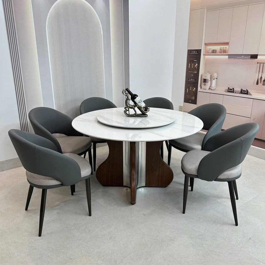 Bộ bàn ăn tròn mặt đá HAK84 + ghế ăn VNC89 mang đến vẻ đẹp tinh tế và sang trọng cho phòng ăn của bạn. Mặt bàn đá thạch anh sáng bóng, kết hợp cùng ghế da PU – vải thô cao cấp giúp không gian trở nên hài hòa, ấm cúng và đậm chất hiện đại. Đây là lựa chọn lý tưởng cho những ai yêu thích phong cách sống tinh tế và tiện nghi.