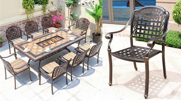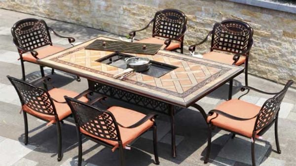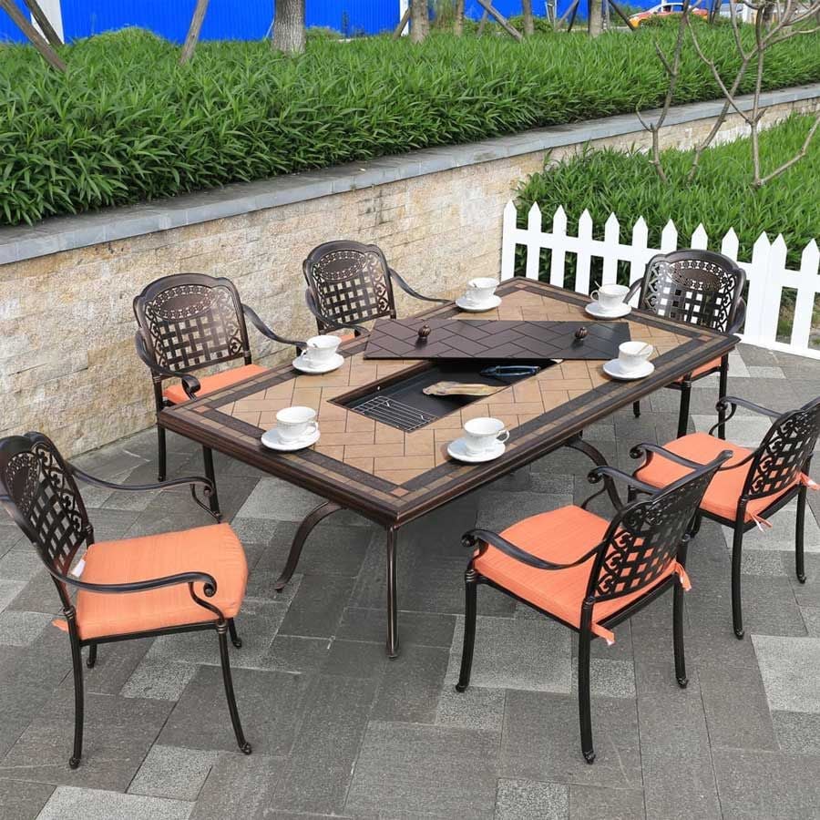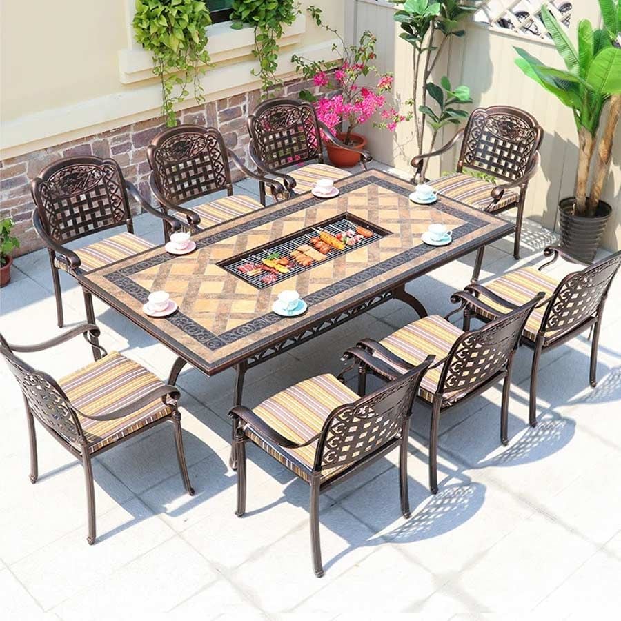 - Chất liệu cao cấp: Nhôm đúc sơn tĩnh điện: Chống gỉ sét, chịu lực tốt, phù hợp với mọi điều kiện thời tiết. Tích hợp bếp nướng: Sản phẩm có sẵn bếp nướng điện hoặc bếp nướng than, tiện lợi cho các bữa tiệc ngoài trời.