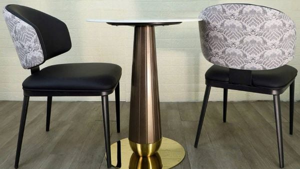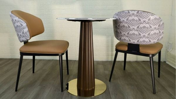 Bàn ăn sở hữu mặt đá mạ pha lê sang trọng, họa tiết sắc nét, độ bóng cao, chống nước – chống trầy hiệu quả. Chân bàn thép sơn vân gỗ kết hợp mâm inox mạ vàng tạo điểm nhấn đẳng cấp.