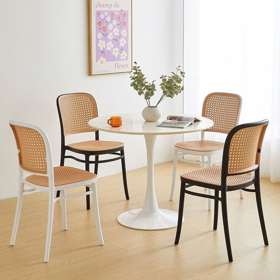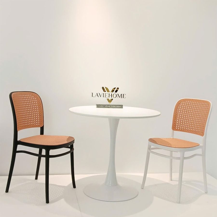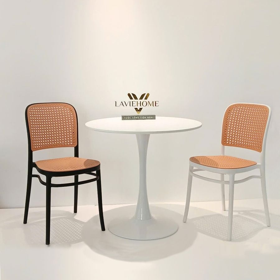 - Ghế khung nhựa đúc, lưng và đế ngồi bằng nhựa giả mây, thiết kế nhẹ nhàng nhưng chắc chắn, phù hợp cho cả không gian trong nhà và ngoài trời.