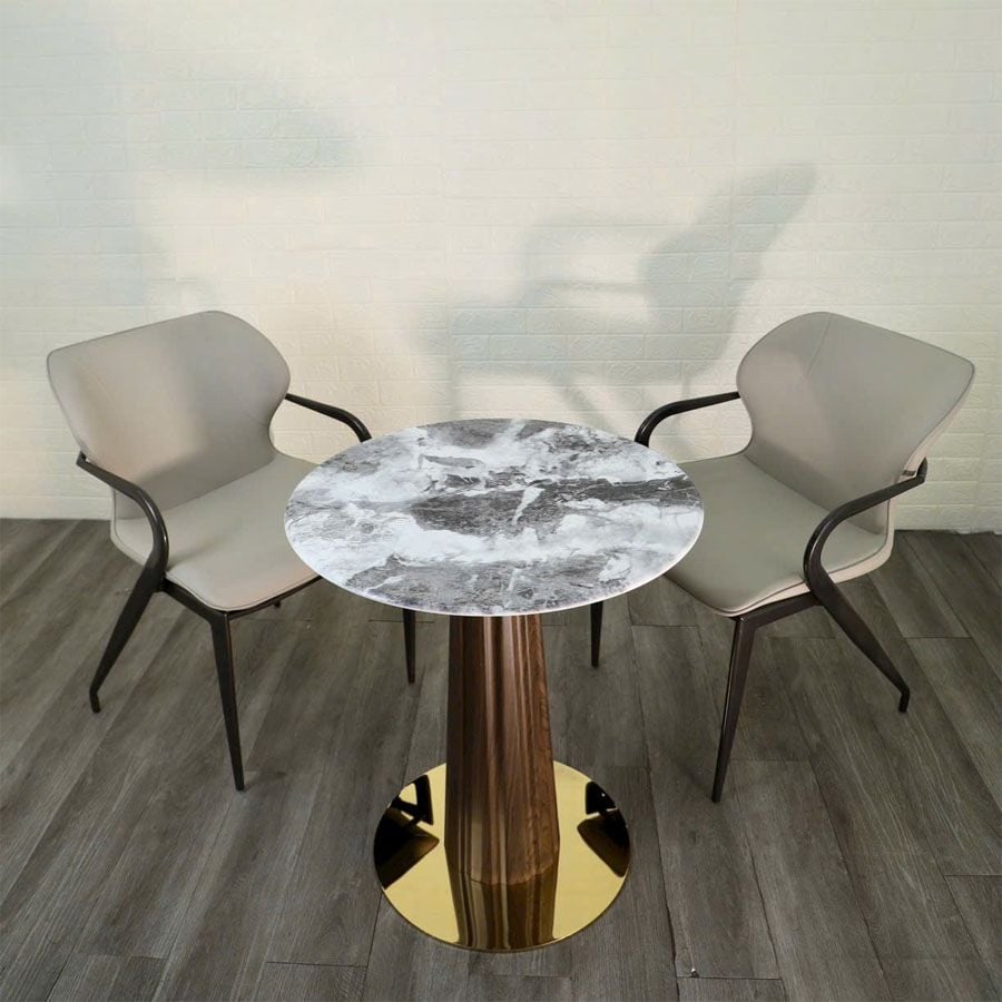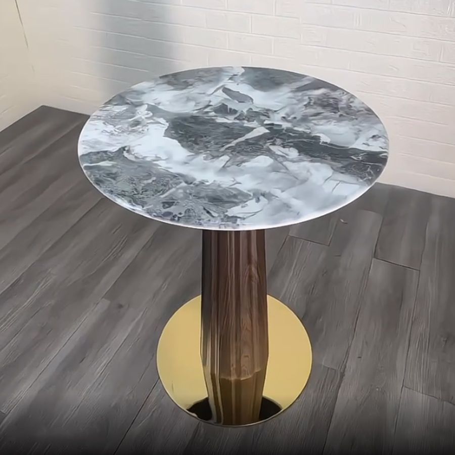 Chất liệu bàn: Mặt đá mạ pha lê, chân thép sơn vân gỗ, mâm inox mạ vàng