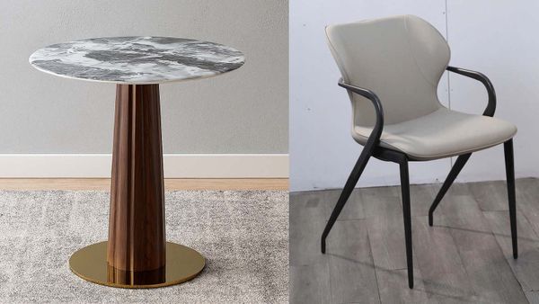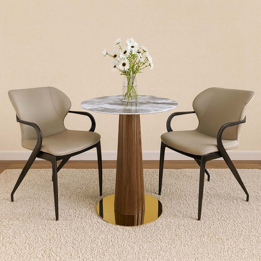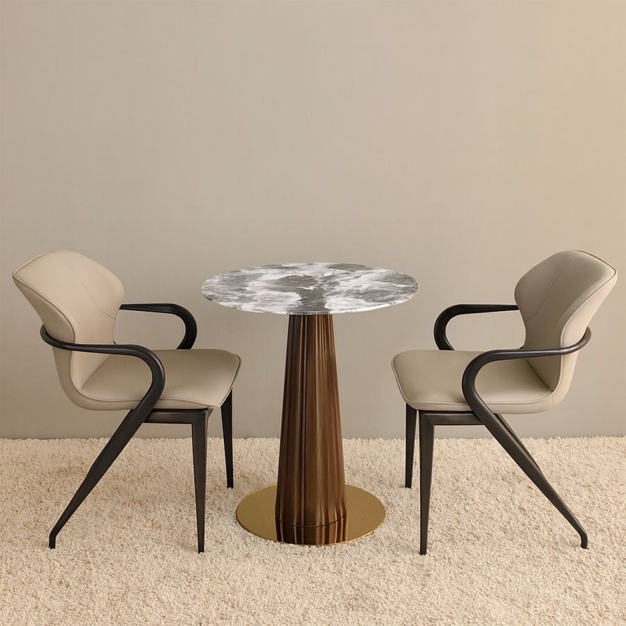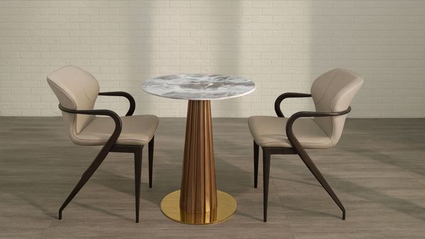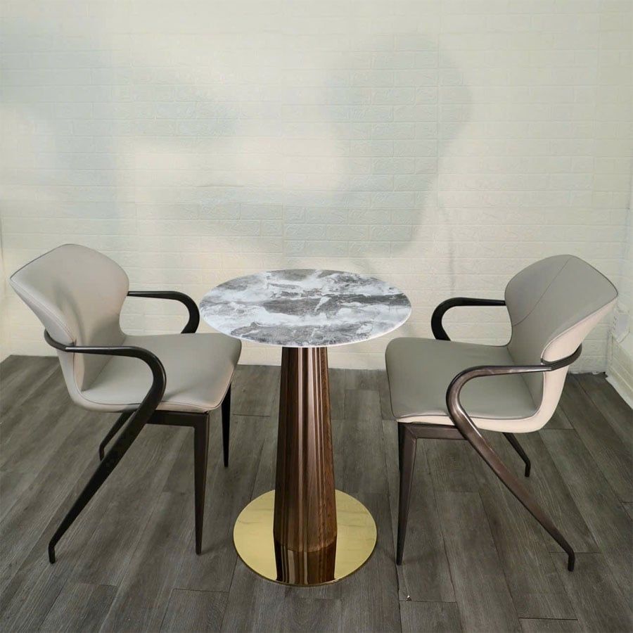 Bộ bàn ghế cafe VSCF500 + VS296 là lựa chọn hoàn hảo cho những không gian quán cafe, nhà hàng hay phòng tiếp khách cần sự tinh tế và hiện đại. Bàn mặt đá mạ pha lê mang đến sự sang trọng và đẳng cấp, kết hợp cùng chân thép sơn vân gỗ và mâm inox mạ vàng tạo điểm nhấn độc đáo. Ghế ăn VS296 với phần lưng bọc da simili cao cấp, thiết kế bo cong nhẹ nhàng và chân thép chắc chắn giúp người ngồi cảm thấy thoải mái và dễ chịu trong thời gian dài.