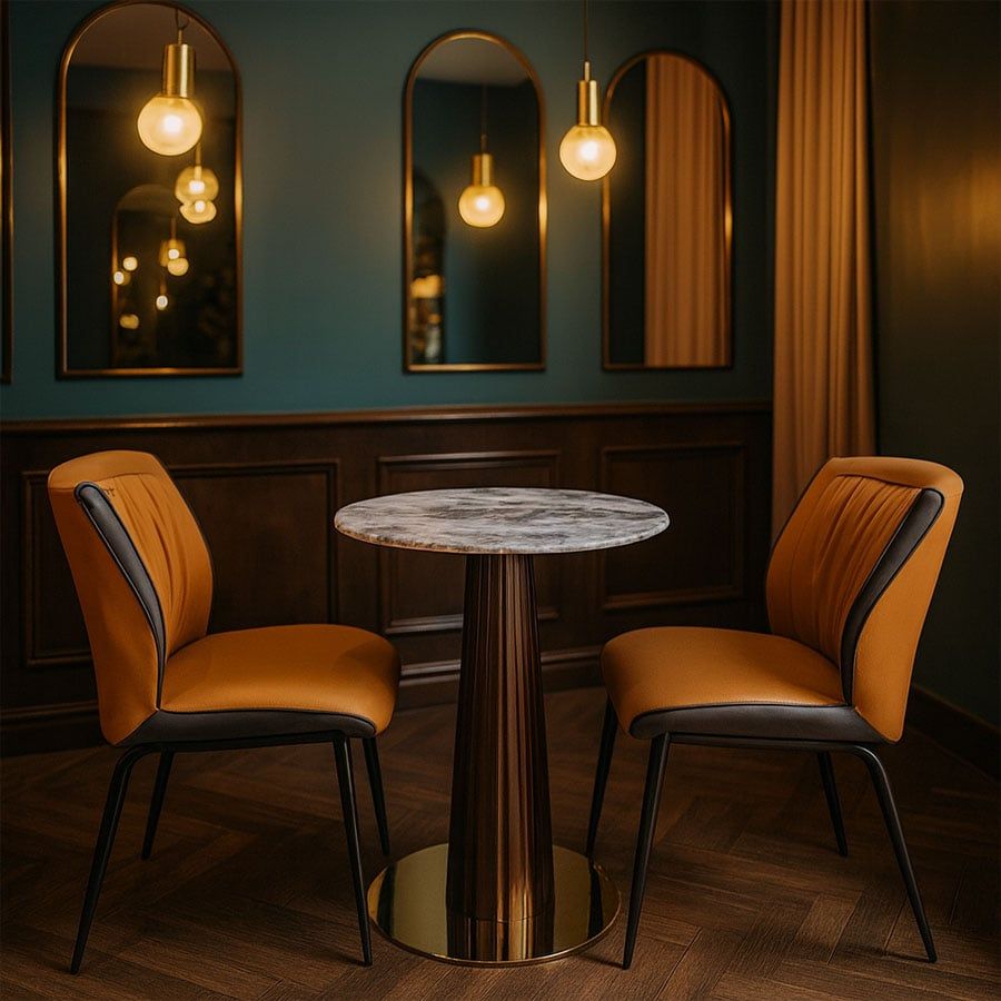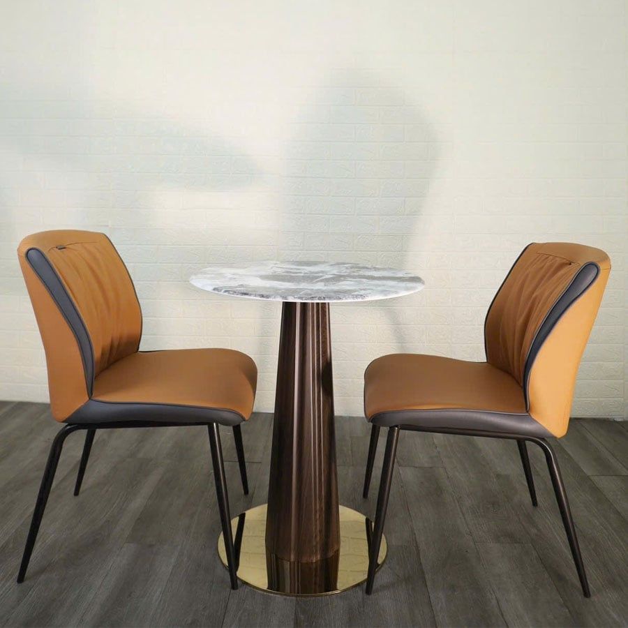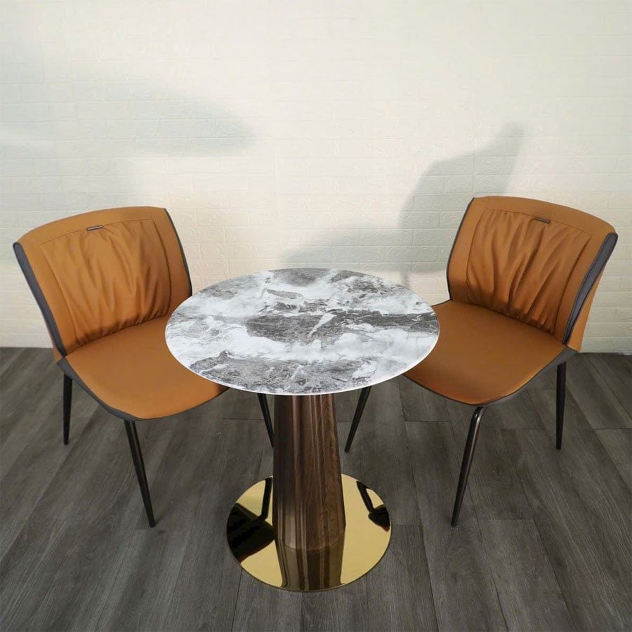 Bộ bàn ghế cafe VSCF500 + VS612 mang phong cách hiện đại, tinh tế, phù hợp cho nhiều không gian từ quán cafe, nhà hàng đến góc thư giãn tại gia. Với mặt bàn đá mạ pha lê cao cấp kết hợp cùng chân thép sơn vân gỗ và mâm inox mạ vàng, sản phẩm vừa sang trọng vừa chắc chắn. Ghế ăn bọc da PU cao cấp với đường may tỉ mỉ, đi kèm khung thép sơn tĩnh điện bền bỉ, đem đến trải nghiệm thoải mái và phong cách tinh tế.