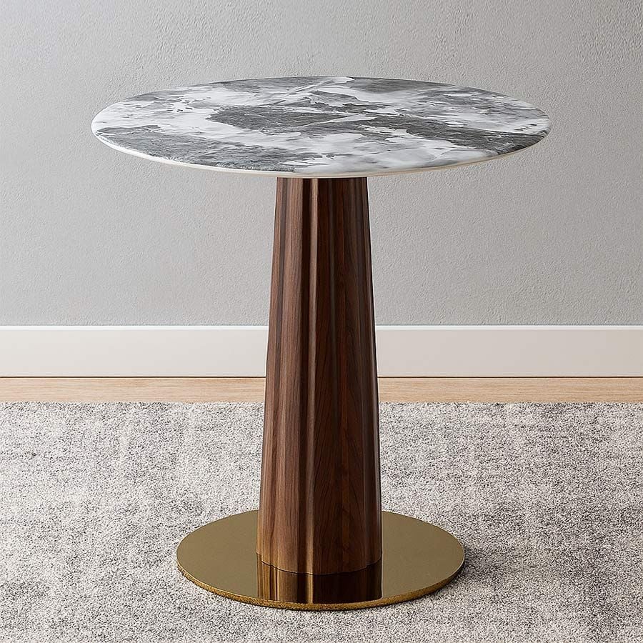 Chất liệu bàn: Mặt đá mạ pha lê, chân thép sơn vân gỗ, mâm inox mạ vàng
