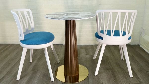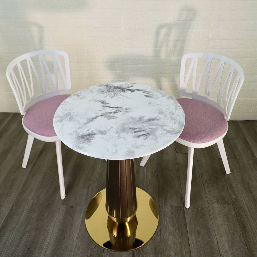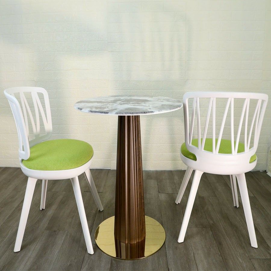 Mặt bàn được làm từ đá mạ pha lê sang trọng, kết hợp với chân thép vân gỗ và mâm inox mạ vàng chắc chắn, tạo điểm nhấn nổi bật cho không gian. Ghế nhựa đúc nguyên khối có lót nệm êm ái, đa dạng màu sắc để dễ dàng phối hợp với nhiều phong cách nội thất khác nhau.