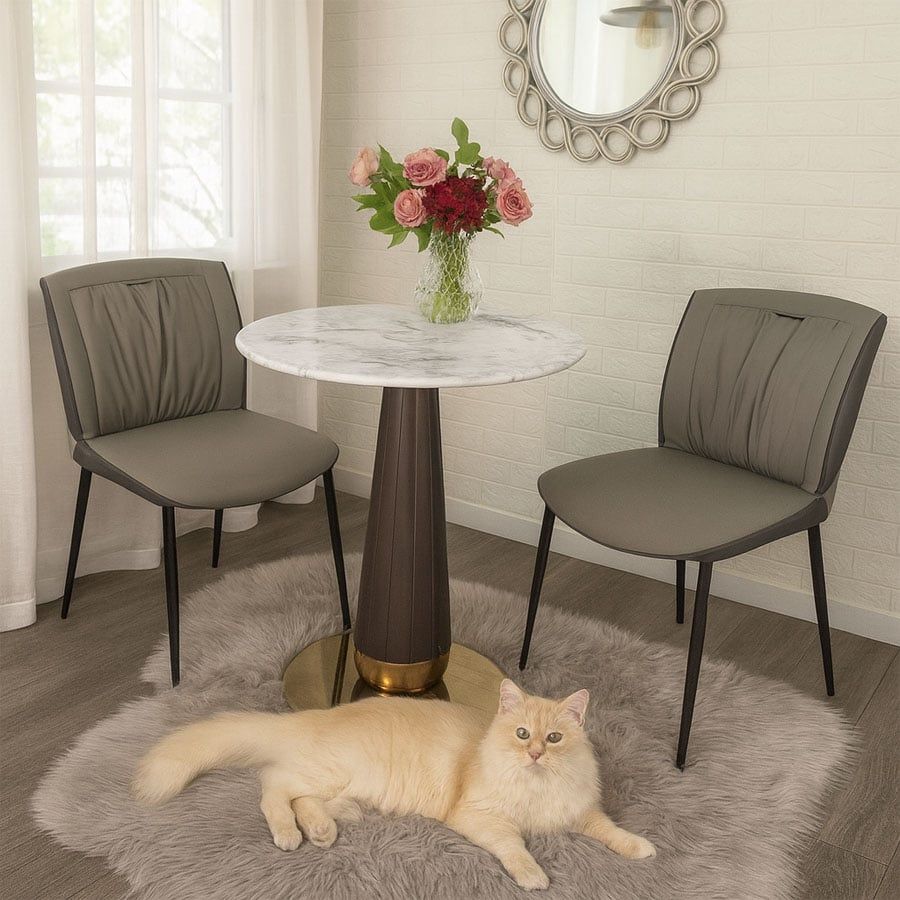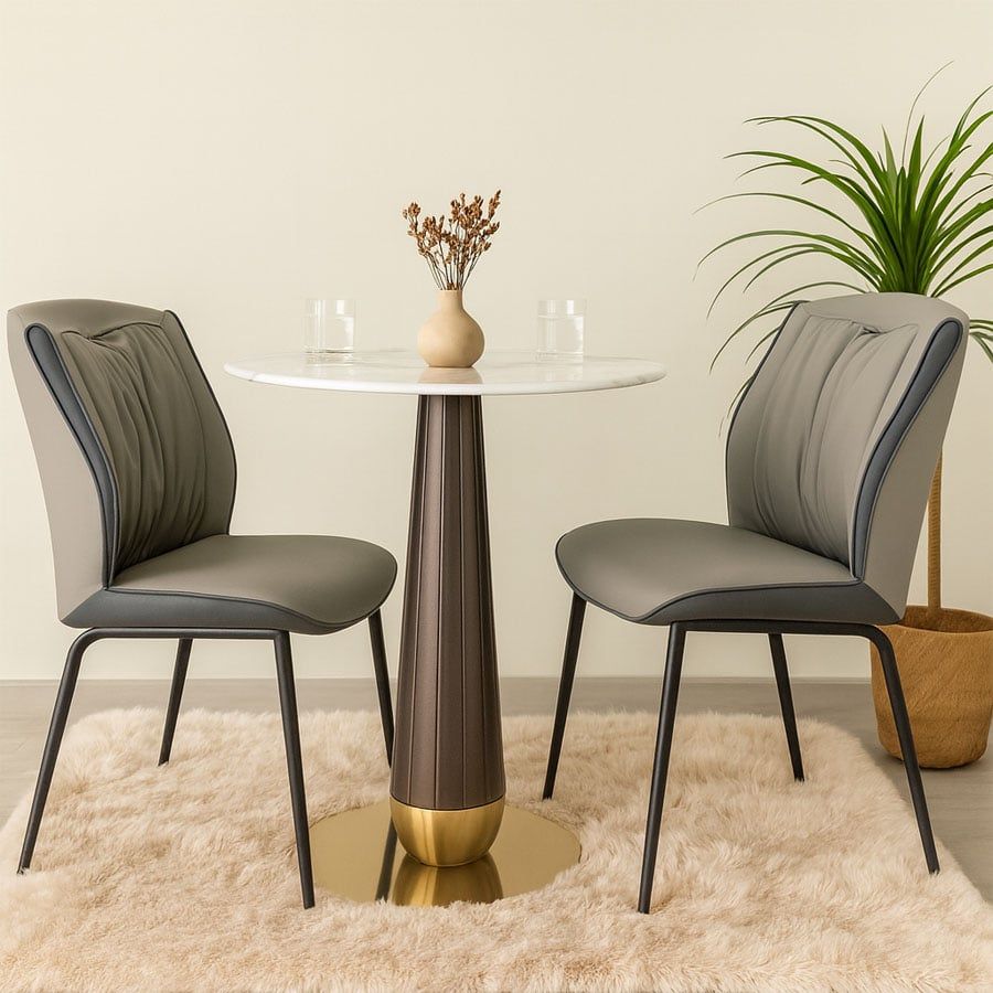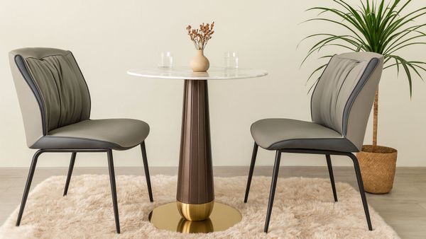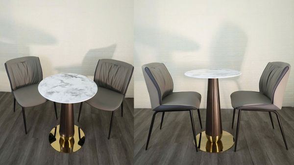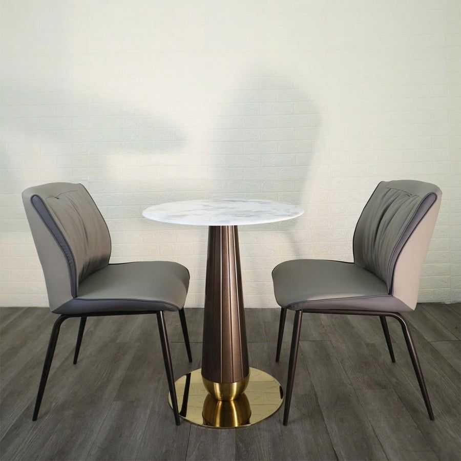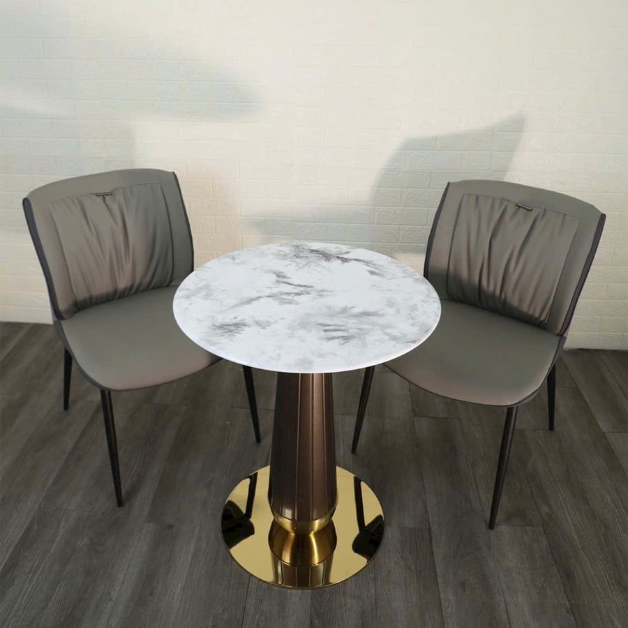 Bộ bàn ghế cafe VSCF501 + VS612 mang phong cách hiện đại, tinh tế, phù hợp cho nhiều không gian từ quán cafe, nhà hàng đến góc thư giãn tại gia. Với mặt bàn đá mạ pha lê cao cấp kết hợp cùng chân thép sơn vân gỗ và mâm inox mạ vàng, sản phẩm vừa sang trọng vừa chắc chắn. Ghế ăn bọc da PU cao cấp với đường may tỉ mỉ, đi kèm khung thép sơn tĩnh điện bền bỉ, đem đến trải nghiệm thoải mái và phong cách tinh tế.