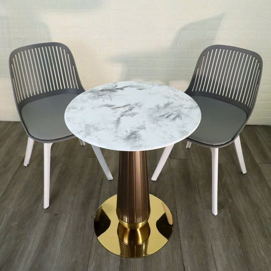 Chất liệu bàn: Mặt đá mạ pha lê, chân thép sơn vân gỗ, mâm inox mạ vàng