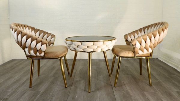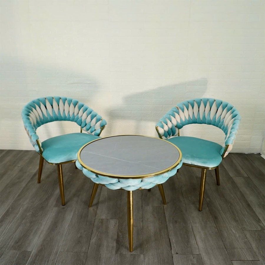 Bộ bàn ghế cafe VSW06 + VW02 mang đến một thiết kế độc đáo, nổi bật với phần ghế bọc nhung phối hai màu cao cấp, tạo điểm nhấn khác biệt cho không gian. Sự kết hợp giữa mặt bàn đá phiến tinh tế và chân thép xi mạ vàng chắc chắn giúp sản phẩm vừa sang trọng vừa bền bỉ. Đây là lựa chọn hoàn hảo cho quán cafe, khách sạn, resort hay không gian tiếp khách tại gia.