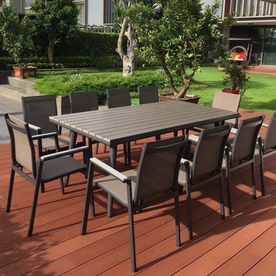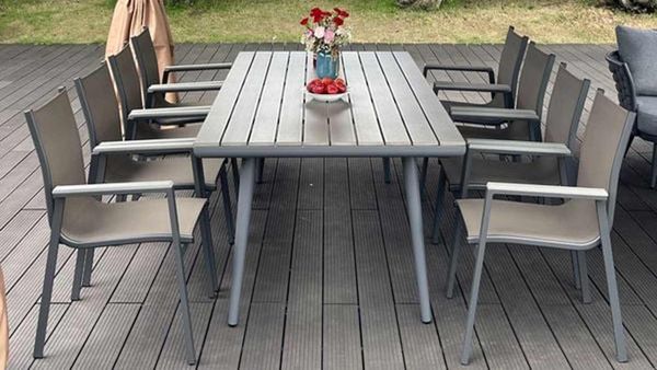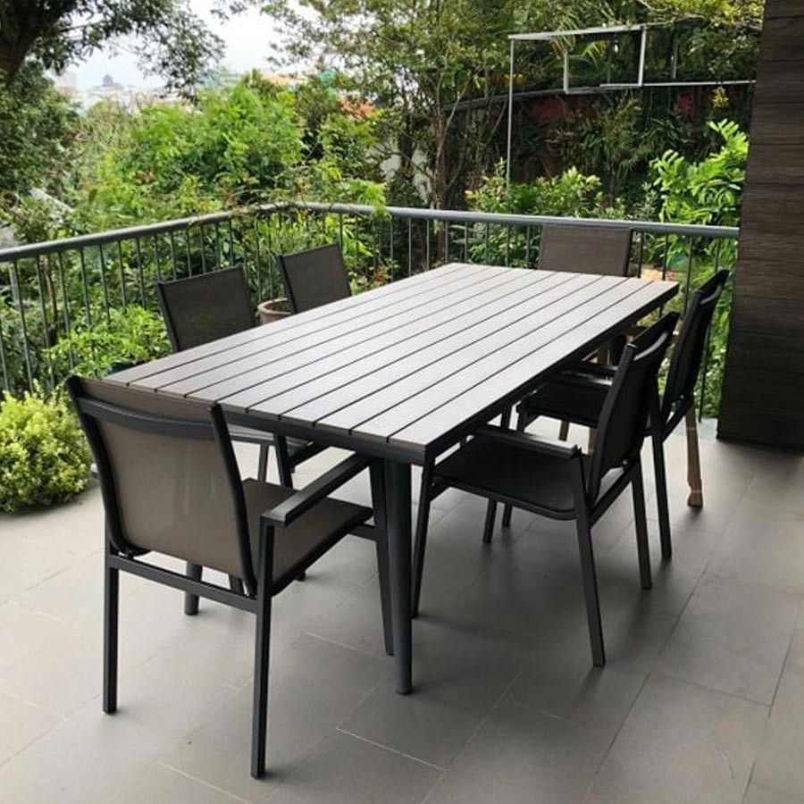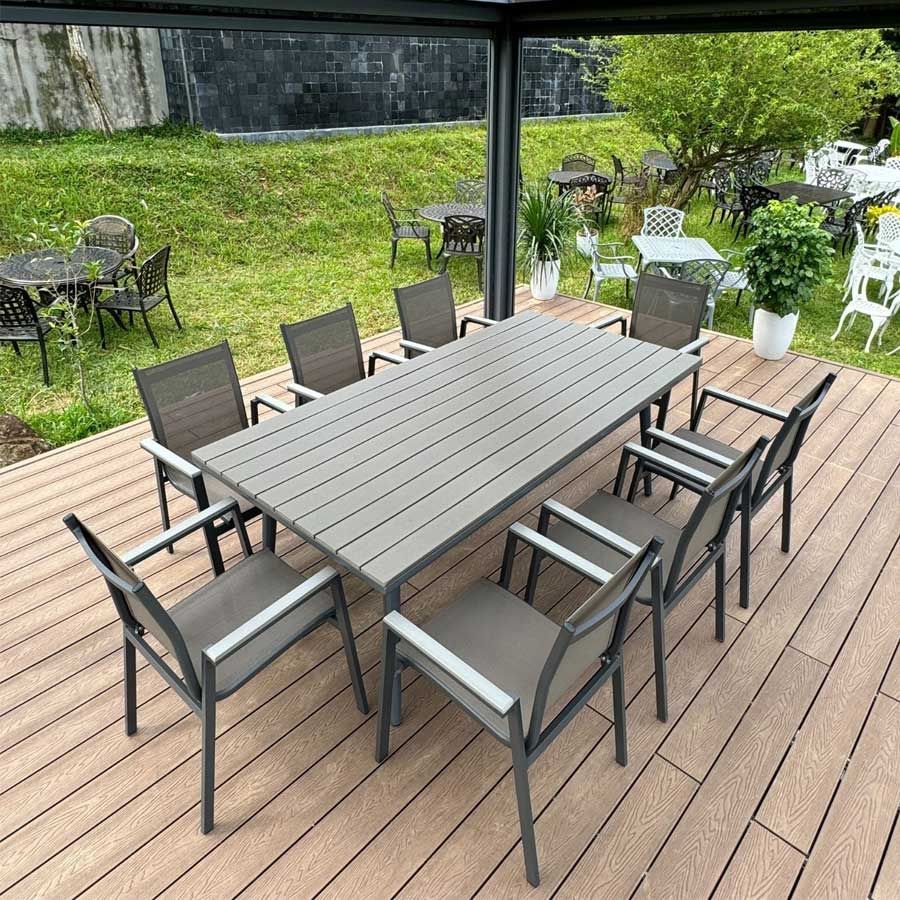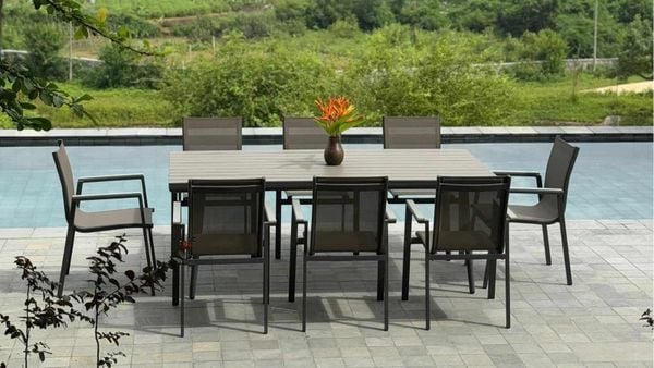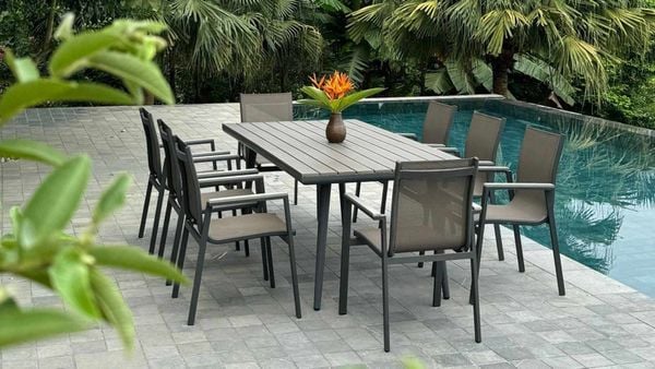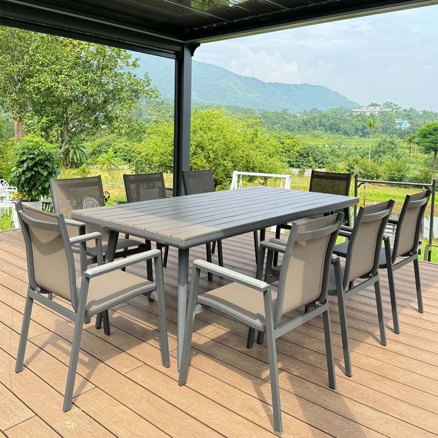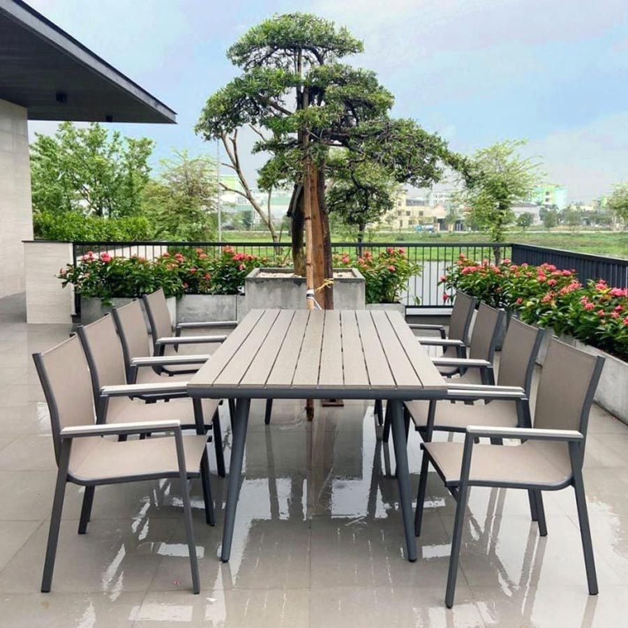 - Chất liệu cao cấp: Bàn: Khung nhôm sơn tĩnh điện chống gỉ, mặt bàn nan Polywood giả gỗ bền bỉ, chống nước, dễ dàng vệ sinh. Ghế: Khung nhôm đúc cứng cáp, lưng và đế ngồi lưới Textilen chống nóng, tạo sự thông thoáng và thoải mái khi sử dụng, tay vịn bằng nan Composite hiện đại.