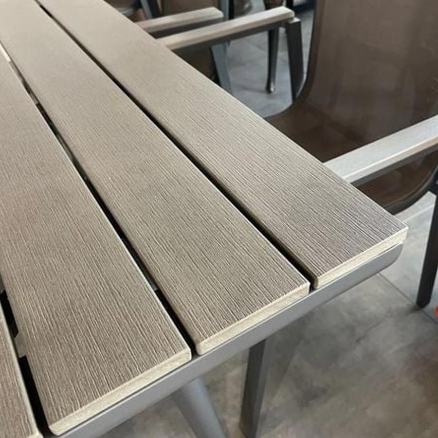 Chất liệu bàn: Khung nhôm sơn tĩnh điện + nan Polywood giả gỗ