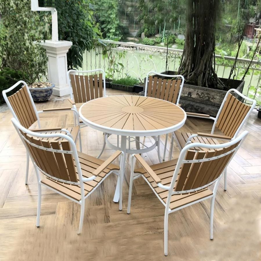 Chất liệu bàn: Khung nhôm sơn tĩnh điện, mặt bàn nan Polywood giả gỗ chống thấm nước