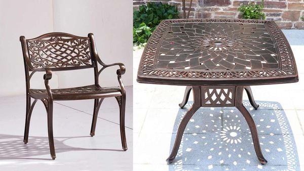 - Hoa văn tinh xảo trên mặt bàn và ghế tạo điểm nhấn thẩm mỹ cho không gian ngoại thất