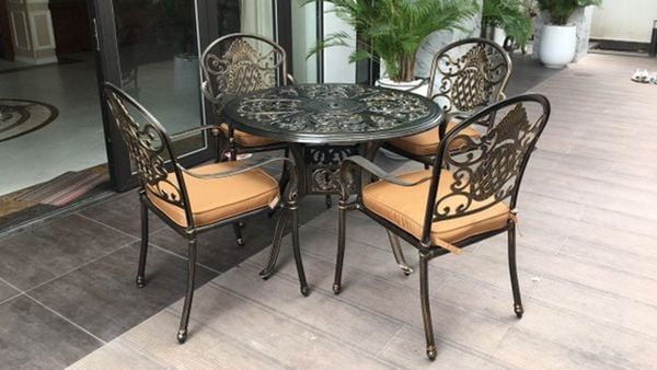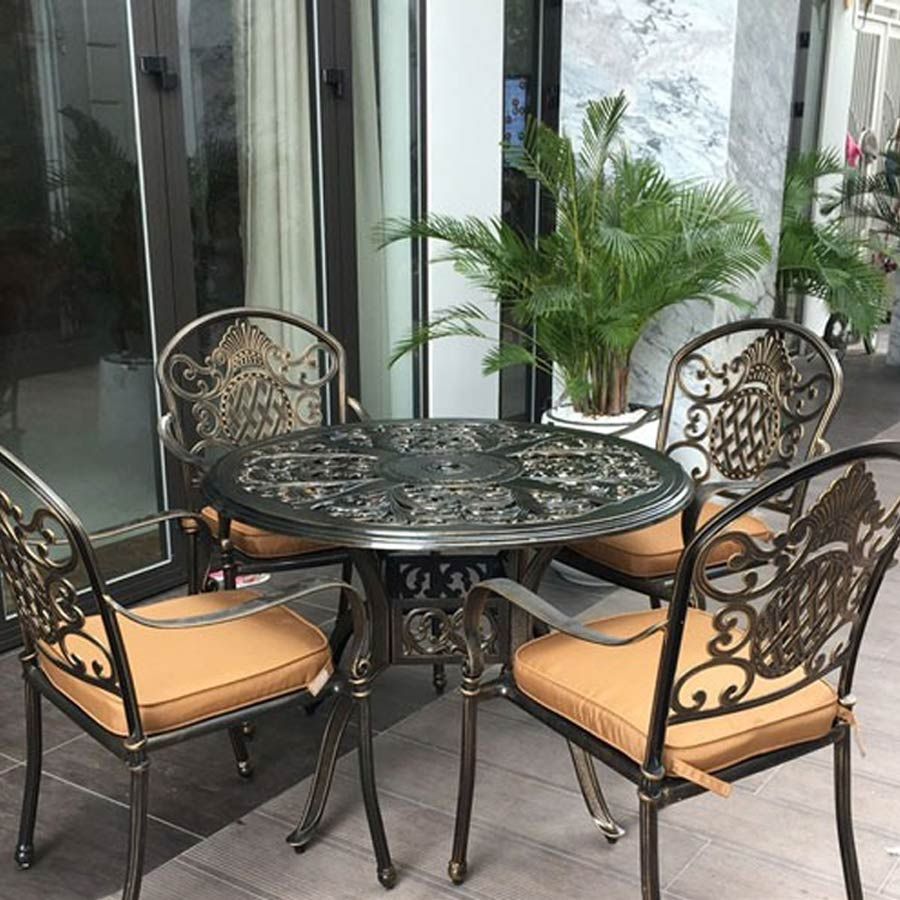 Màu đồng sang trọng của bàn và ghế mang lại sự hài hòa và dễ dàng kết hợp với các phong cách trang trí khác nhau. Bộ bàn ghế có thiết kế cổ điển pha chút hiện đại, tạo điểm nhấn nổi bật cho không gian ngoại thất.