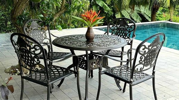 - Hoa văn tinh xảo trên mặt bàn và ghế tạo điểm nhấn thẩm mỹ cho không gian ngoại thất