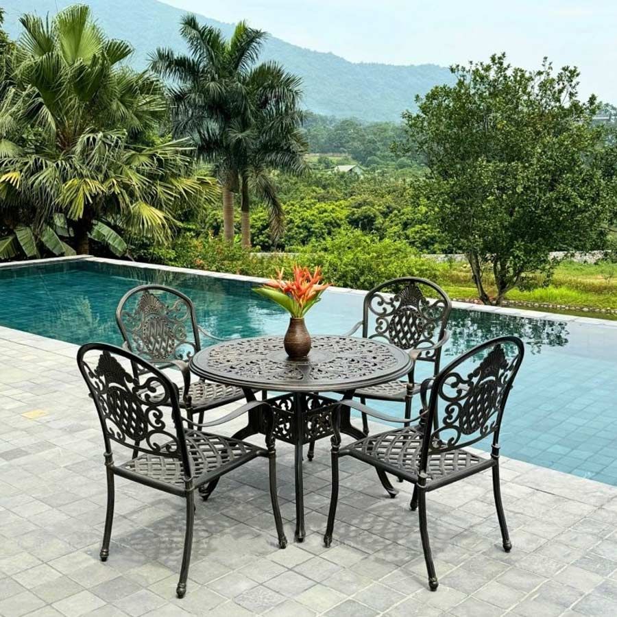 Bàn sân vườn được làm từ nhôm đúc nguyên khối, có khả năng chống gỉ sét và chịu lực tốt. Lớp sơn tĩnh điện giúp bảo vệ bề mặt bàn khỏi các tác động của thời tiết, giữ cho sản phẩm luôn bền đẹp. Mặt bàn với hoa văn tinh xảo mang lại vẻ đẹp cổ điển và sang trọng.