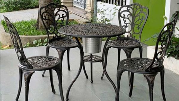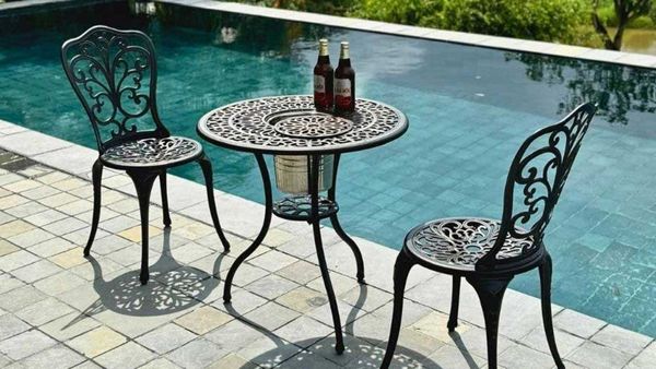 - Hoa văn tinh xảo trên mặt bàn và ghế tạo điểm nhấn thẩm mỹ cho không gian ngoại thất