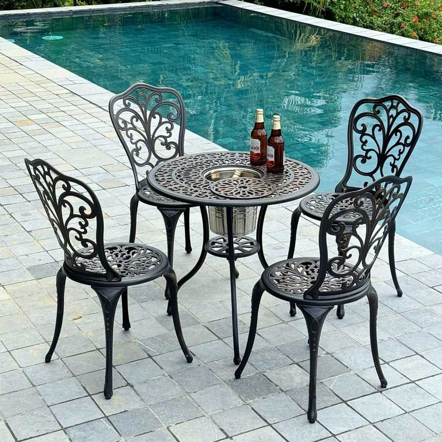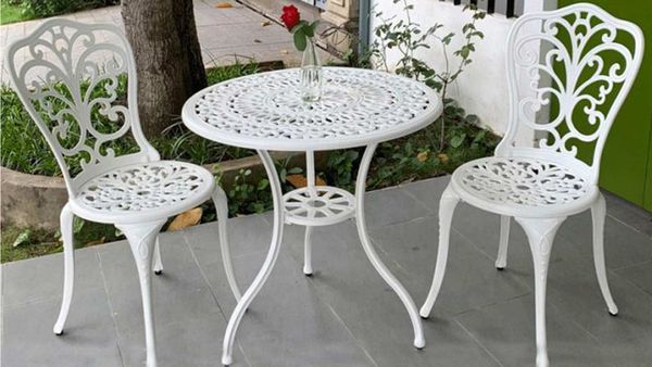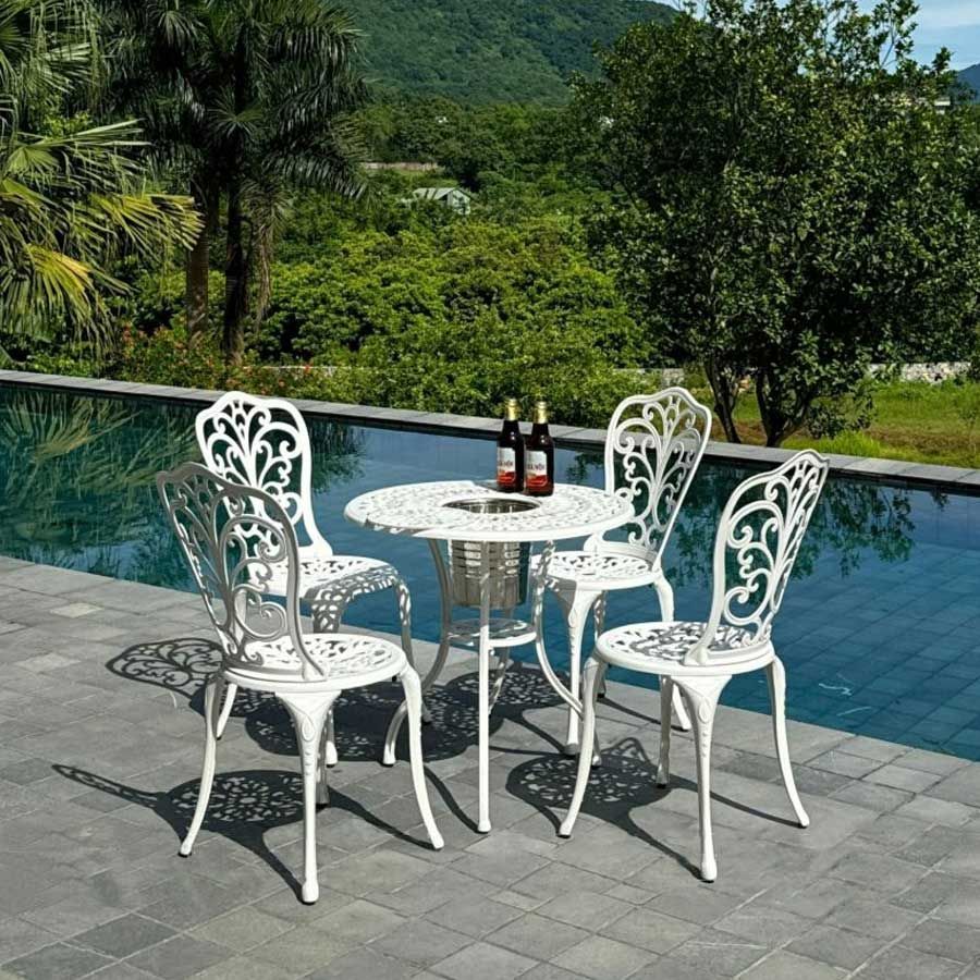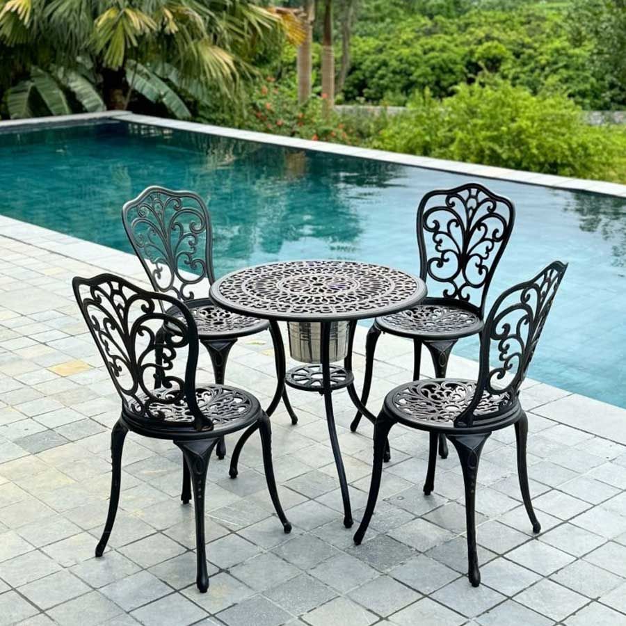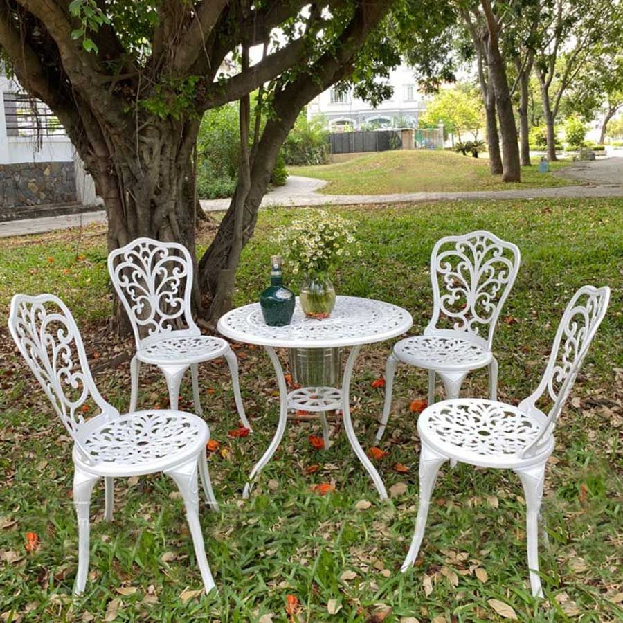 Bàn sân vườn được làm từ nhôm đúc nguyên khối, không chỉ nhẹ nhàng và dễ di chuyển mà còn có khả năng chống gỉ sét và chịu lực tốt. Lớp sơn tĩnh điện giúp bảo vệ bề mặt bàn khỏi các tác động của môi trường, giữ cho sản phẩm luôn bền đẹp theo năm tháng. Mặt bàn với hoa văn tinh xảo tạo điểm nhấn thẩm mỹ, phù hợp với nhiều phong cách trang trí khác nhau.