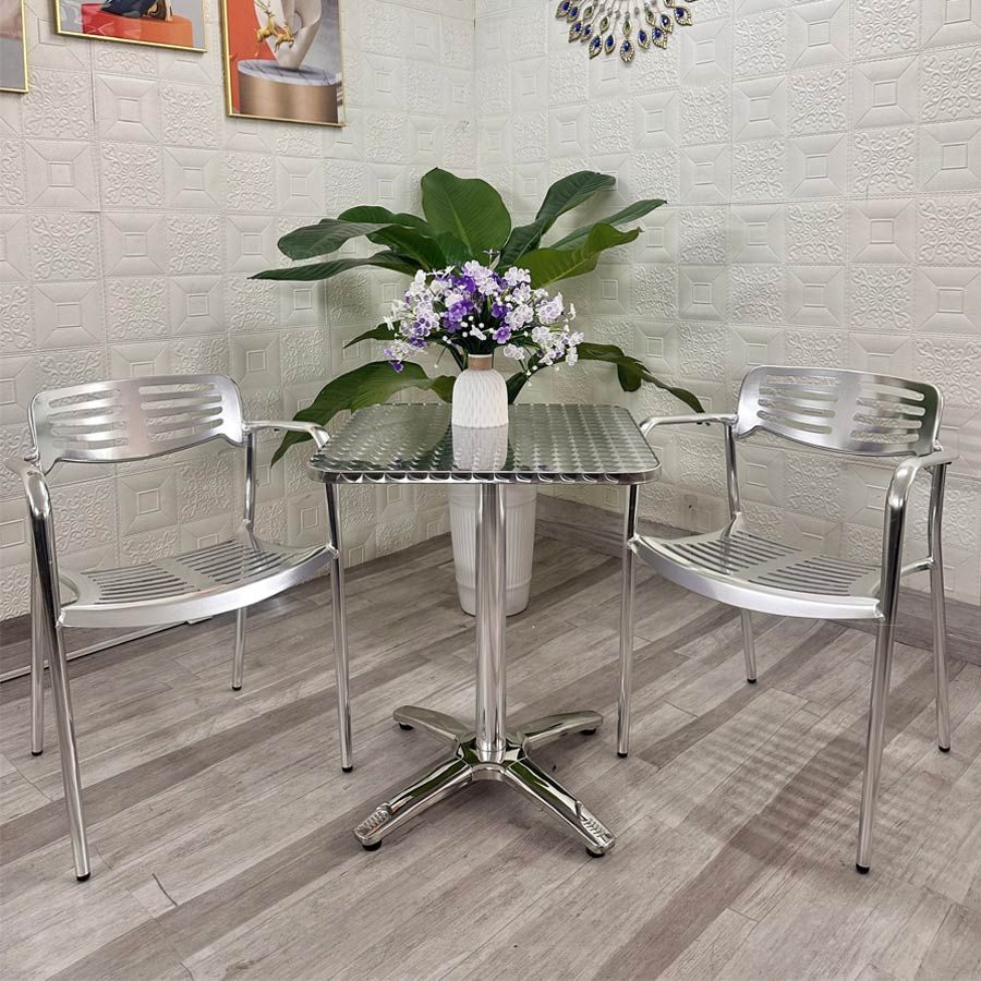 Mặt bàn được làm từ inox 201 cao cấp bọc gỗ bên trong, mang lại sự chắc chắn và cảm giác sang trọng. Ghế được chế tác từ hợp kim nhôm nhẹ nhưng cực kỳ vững chắc, dễ di chuyển và đặc biệt phù hợp với môi trường ngoài trời nhờ khả năng chống gỉ sét và chống bám bẩn hiệu quả.