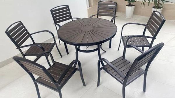 - Chất liệu cao cấp: Bàn: Khung nhôm sơn tĩnh điện chống gỉ sét, mặt bàn bằng nan Polywood giả gỗ, không mối mọt, không cong vênh. Ghế: Khung nhôm đúc chắc chắn, nan ghế Polywood giả gỗ tạo cảm giác sang trọng, dễ dàng bảo quản.