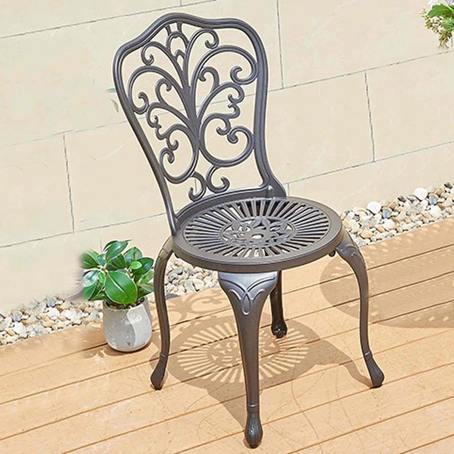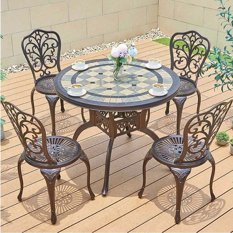 Mặt bàn được chế tác từ nhôm đúc nguyên khối, hoa văn sắc nét, bề mặt chống trầy xước và dễ dàng vệ sinh. Khung bàn và ghế sơn tĩnh điện giúp sản phẩm không bị gỉ sét hay ăn mòn khi sử dụng lâu dài ngoài trời. Ghế có thiết kế tựa lưng cao và rộng rãi, mang lại cảm giác thoải mái khi ngồi lâu. Màu sắc đồng và trắng đồng tạo nên vẻ đẹp thanh lịch, phù hợp với nhiều phong cách trang trí ngoại thất khác nhau.
