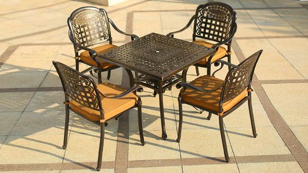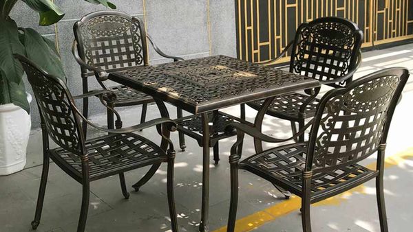 Bàn ngoài trời được làm từ nhôm đúc nguyên khối, không chỉ nhẹ nhàng và dễ di chuyển mà còn có khả năng chống gỉ sét và chịu lực tốt. Lớp sơn tĩnh điện giúp bảo vệ bề mặt bàn khỏi các tác động của môi trường, giữ cho sản phẩm luôn bền đẹp theo năm tháng. Mặt bàn với hoa văn tinh xảo tạo điểm nhấn thẩm mỹ, phù hợp với nhiều phong cách trang trí khác nhau.
