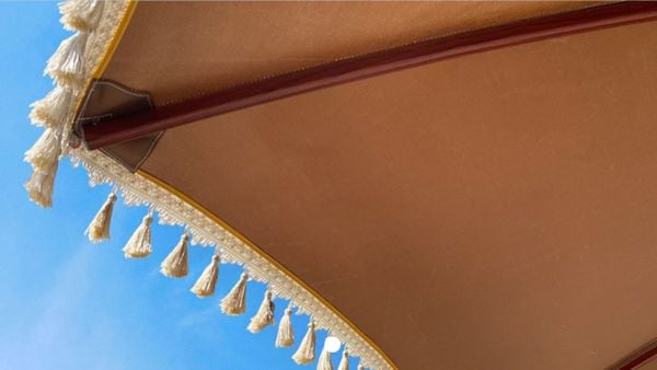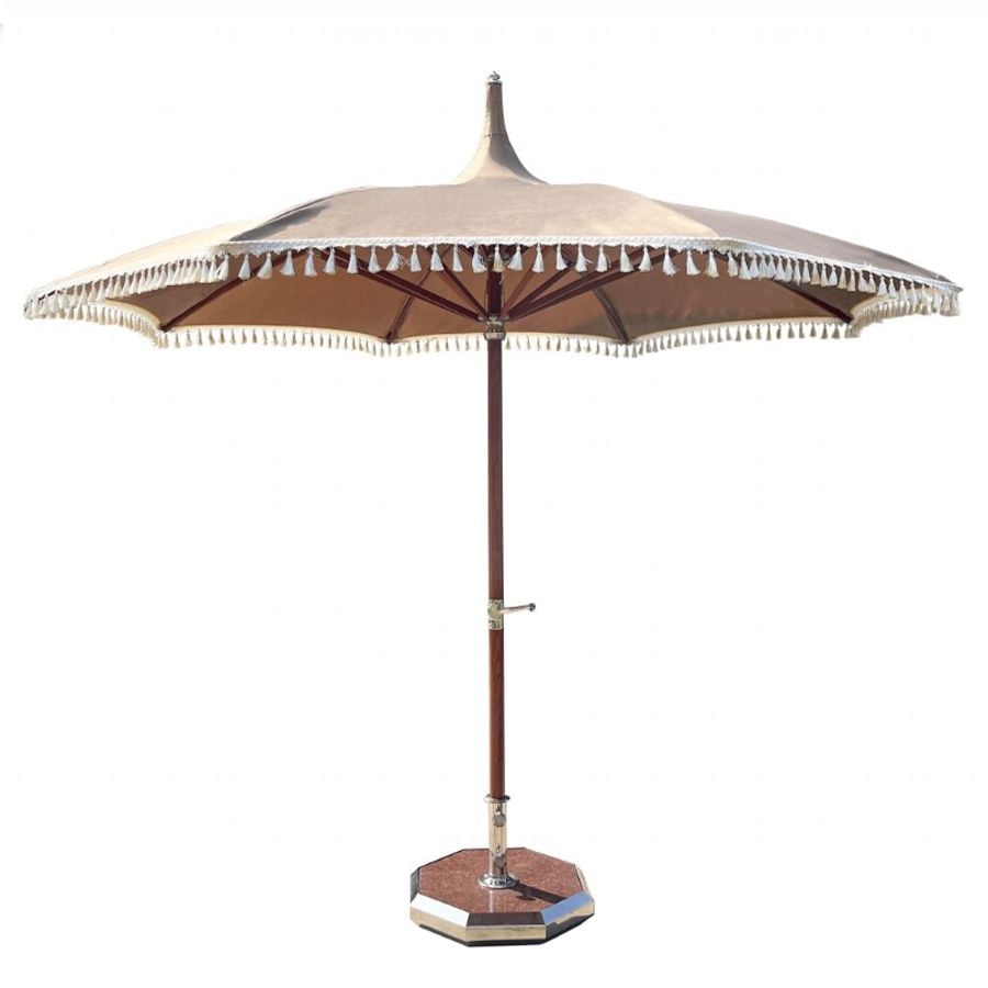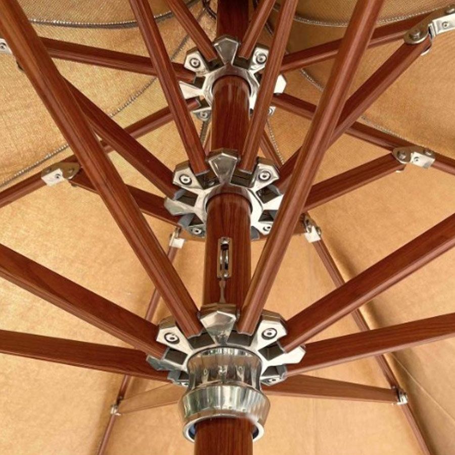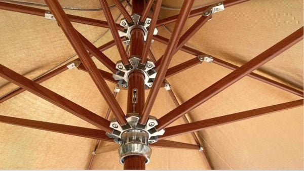 Thân dù bằng nhôm Anod hoặc sơn vân gỗ giúp chống gỉ sét, phù hợp với môi trường ven biển hoặc nơi có độ ẩm cao. Phần áo dù được làm từ vải Sunbrella cao cấp, chống nắng, chống thấm và bền màu theo thời gian.