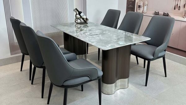 Tựa lưng được thiết kế công thái học, ôm sát lưng, mang đến cảm giác thoải mái tối đa ngay cả khi ngồi lâu. Tông màu trung tính kết hợp cùng chân titan sáng bóng giúp không gian trở nên thanh lịch và đẳng cấp hơn bao giờ hết.