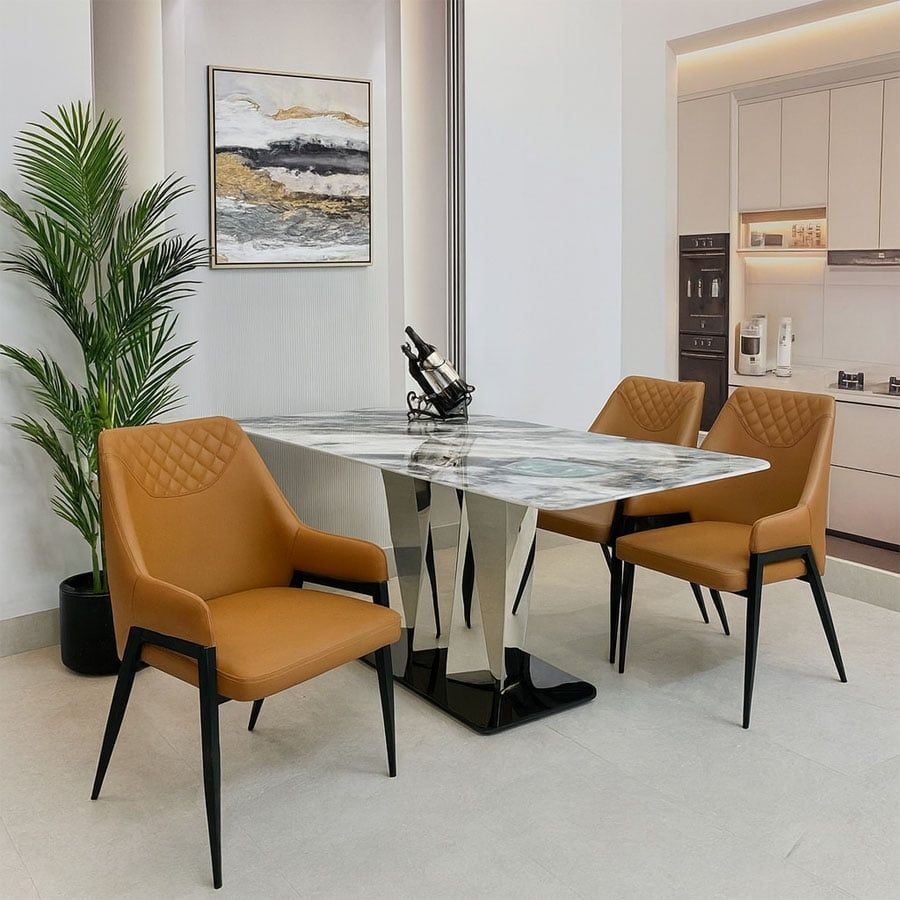 Chất liệu: Đệm ngồi bọc da BOYA cao cấp, chống mèo cào, chống bút mực, dễ vệ sinh. Khung ghế thép mạ titan chắc chắn, bền bỉ và sang trọng.