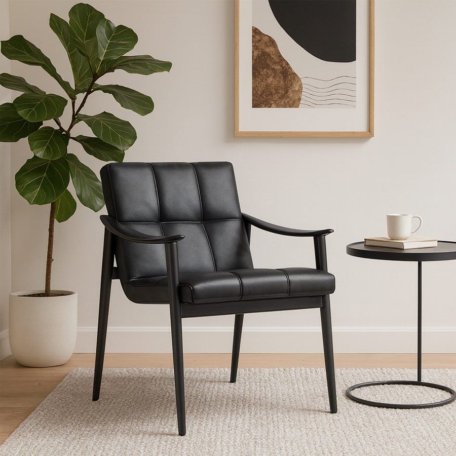 Ghế ăn gỗ sồi Fynn DW13 với thiết kế hiện đại, tay vịn cong thoải mái, chất liệu gỗ sồi Mỹ và da yên ngựa cao cấp, lý tưởng cho phòng ăn sang trọng hoặc không gian tiếp khách tinh tế.