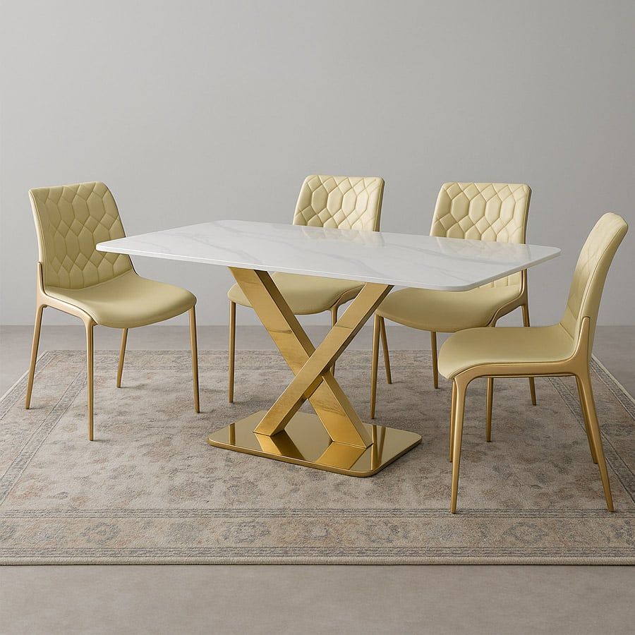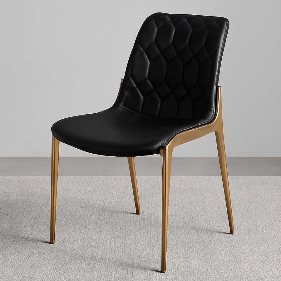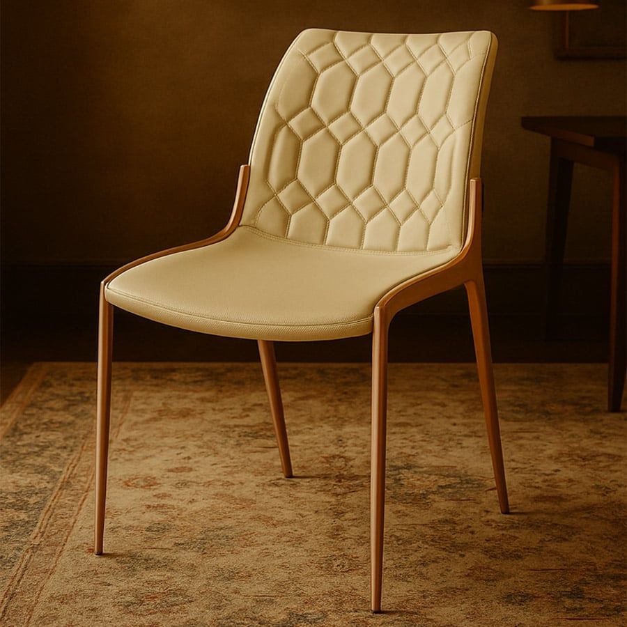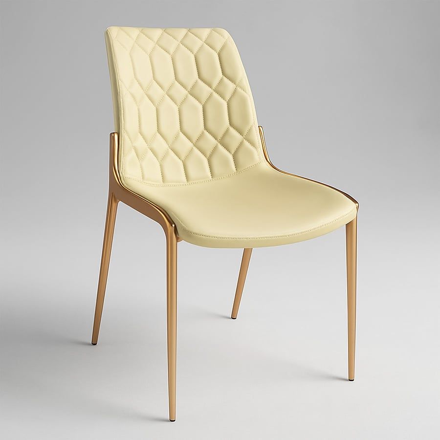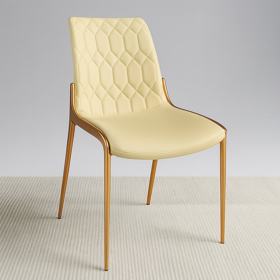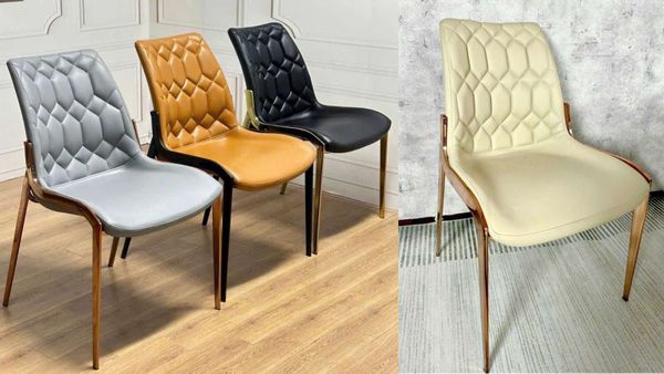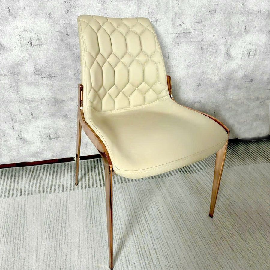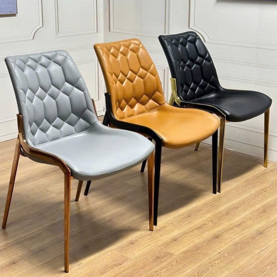 Ghế ăn mạ vàng ADT159 nổi bật với thiết kế lưng tựa chần bông hình kim cương độc đáo, tạo nên hiệu ứng thị giác tinh xảo và đẳng cấp. Tông màu kem trang nhã kết hợp cùng khung thép mạ vàng sang trọng giúp mẫu ghế này dễ dàng hòa hợp với không gian nội thất hiện đại, từ phòng ăn gia đình đến các khu vực tiếp khách cao cấp.