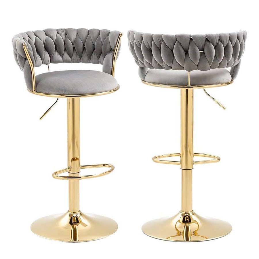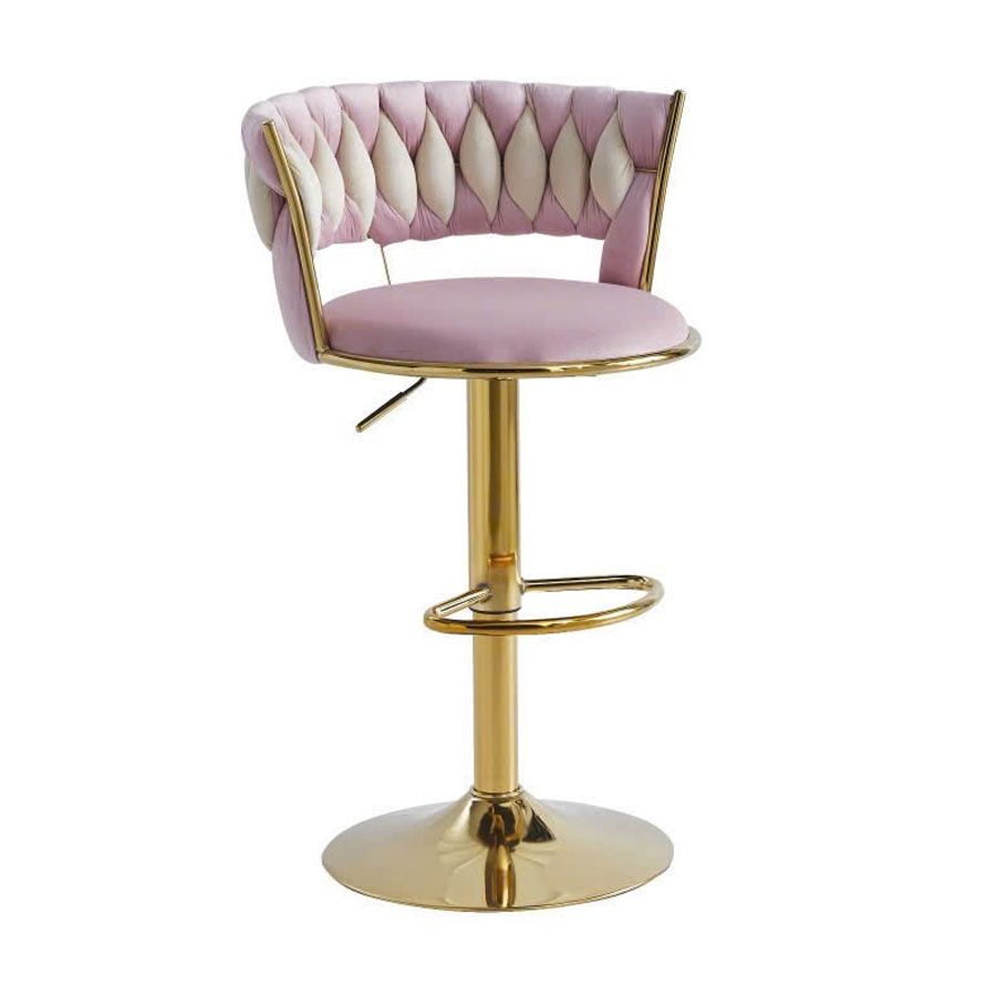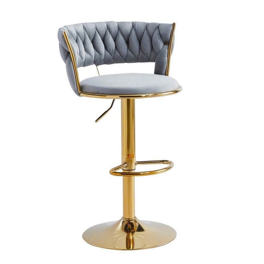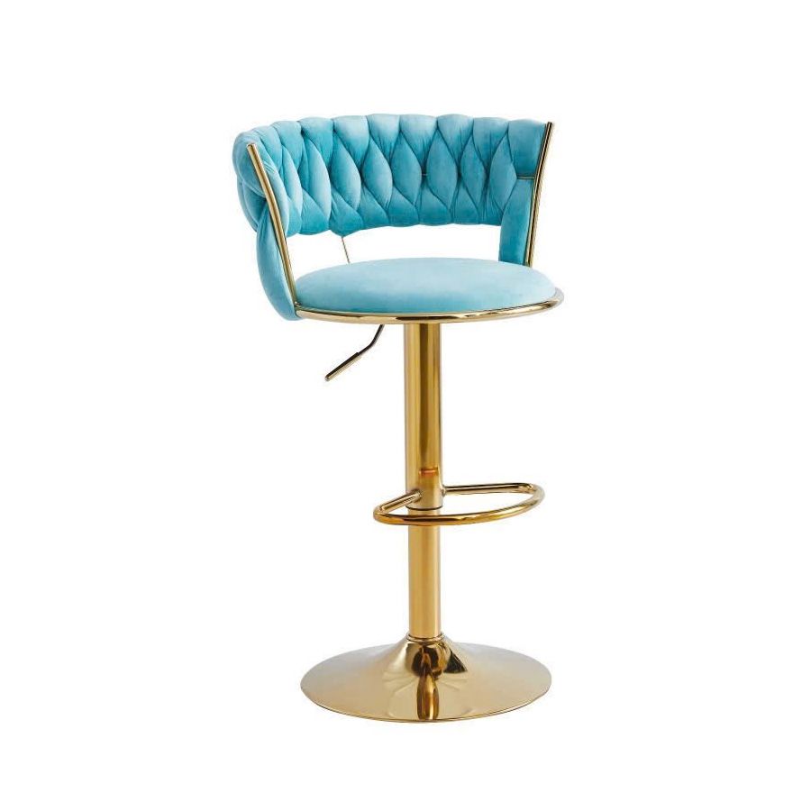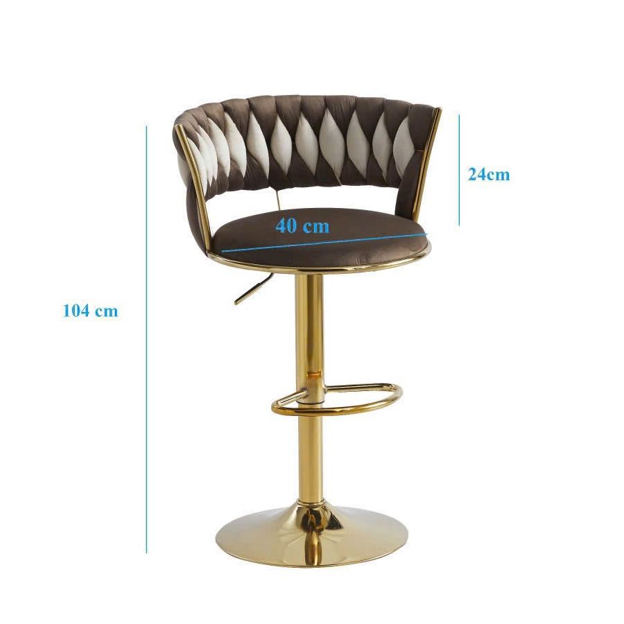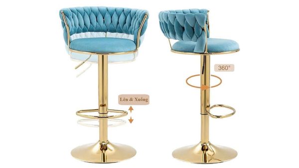 Chất liệu: Ghế quầy bọc vải nhung cao cấp, chân trụ tròn thép mạ vàng/ xi/ đen