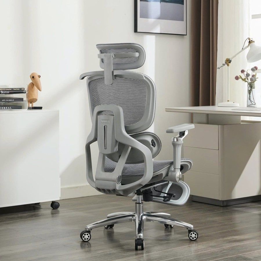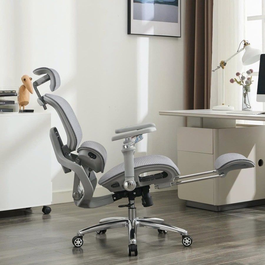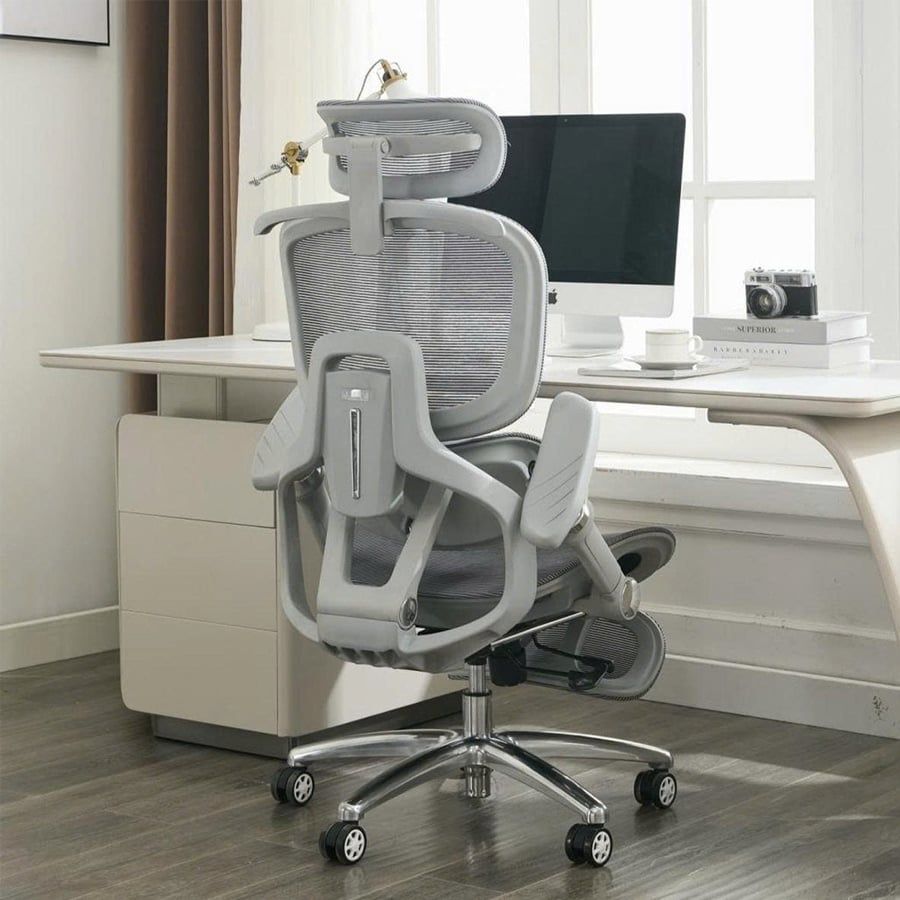 Phần lưng ghế lưới cao cấp ôm sát cơ thể, hỗ trợ hiệu quả vùng cột sống và thắt lưng. Đệm ngồi lưới đàn hồi tốt, thoáng khí, hạn chế bí nóng khi ngồi lâu. Tông màu xám hiện đại, dễ phối hợp với nhiều không gian văn phòng và phòng làm việc tại nhà.