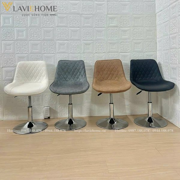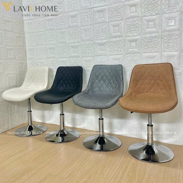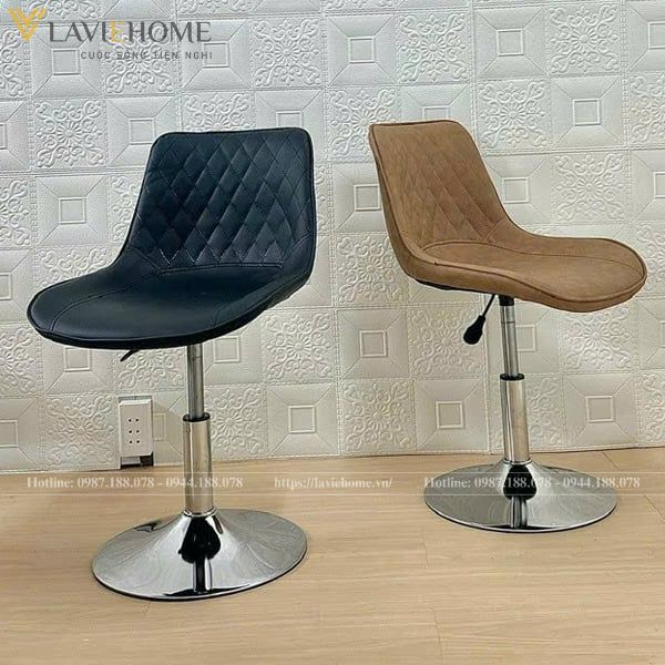 - Chân trụ xoay chắc chắn: Ghế được thiết kế với chân trụ xoay làm từ sắt mạ crom bền bỉ, đảm bảo độ ổn định và khả năng chịu lực tốt, cùng với việc dễ dàng di chuyển.
