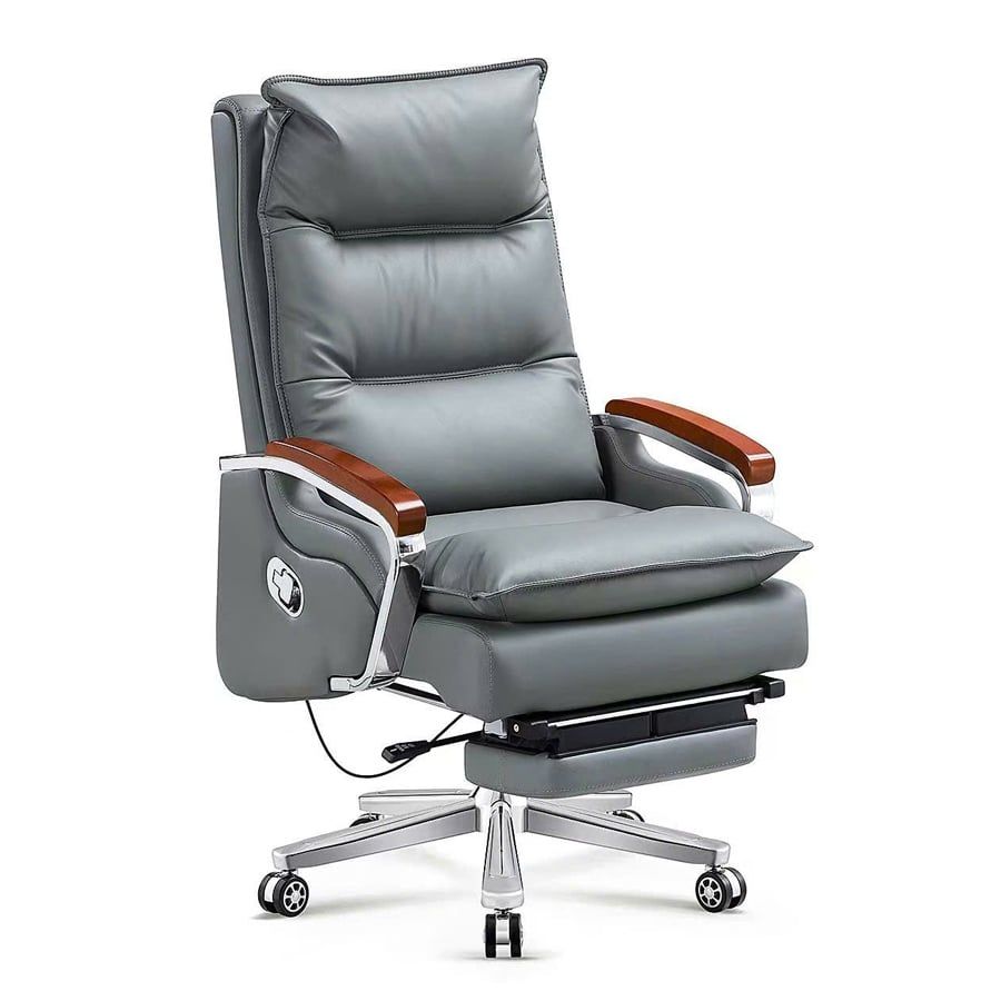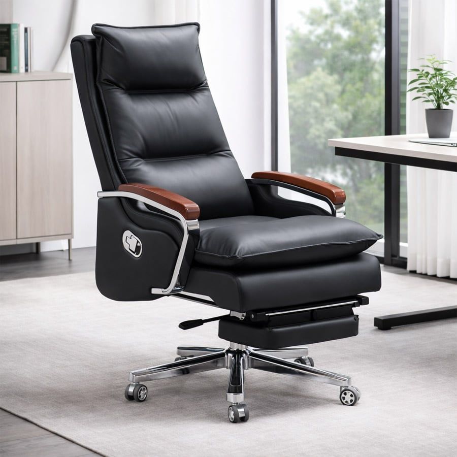 Khung tay ghế mạ crom kết hợp ốp gỗ tạo điểm nhấn sang trọng, đồng thời tăng độ chắc chắn cho sản phẩm. Phần chân xoay bằng thép mạ crom cao cấp cùng hệ thống bánh xe linh hoạt giúp di chuyển dễ dàng trong không gian làm việc.
