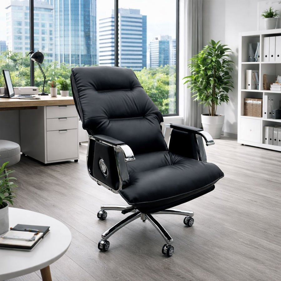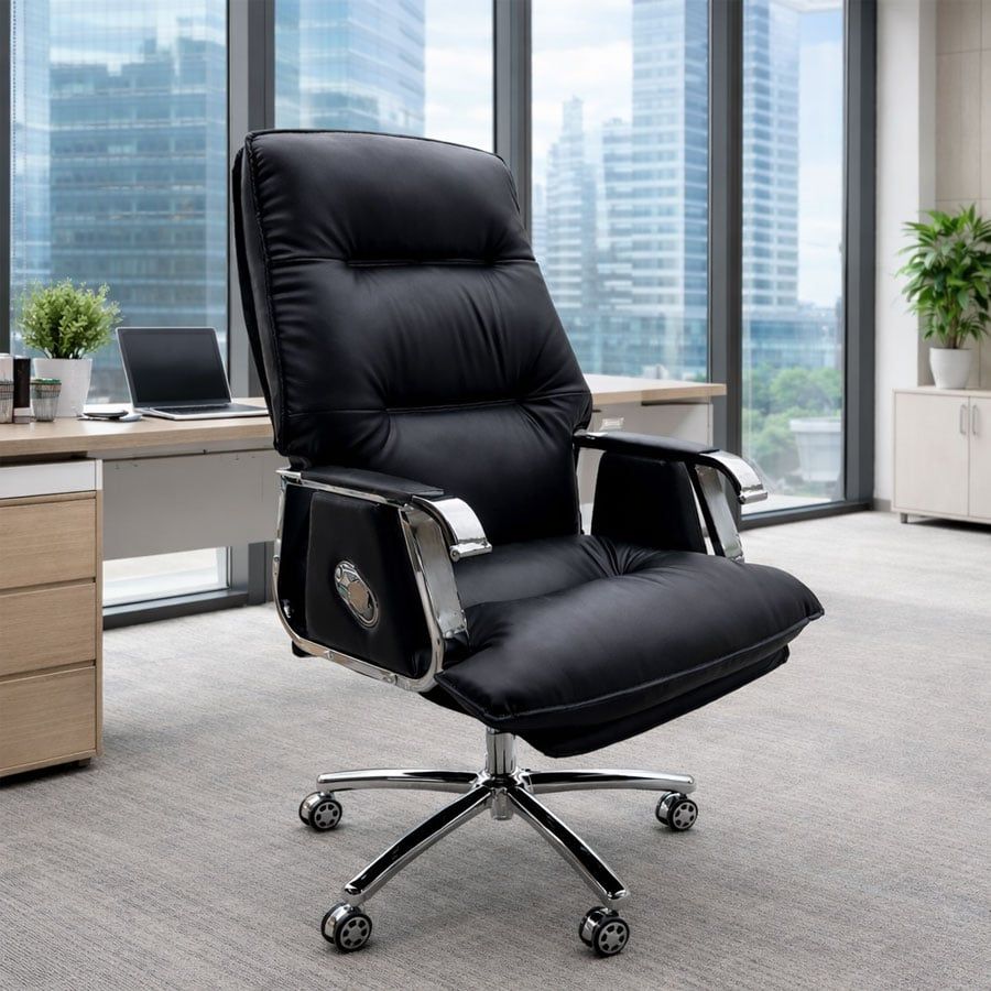 Ghế được bọc da cao cấp, không chỉ tăng tính thẩm mỹ mà còn giúp dễ dàng vệ sinh và bảo quản. Thiết kế lưng ghế cao giúp nâng đỡ phần lưng và cổ, hạn chế cảm giác mỏi khi ngồi lâu.
