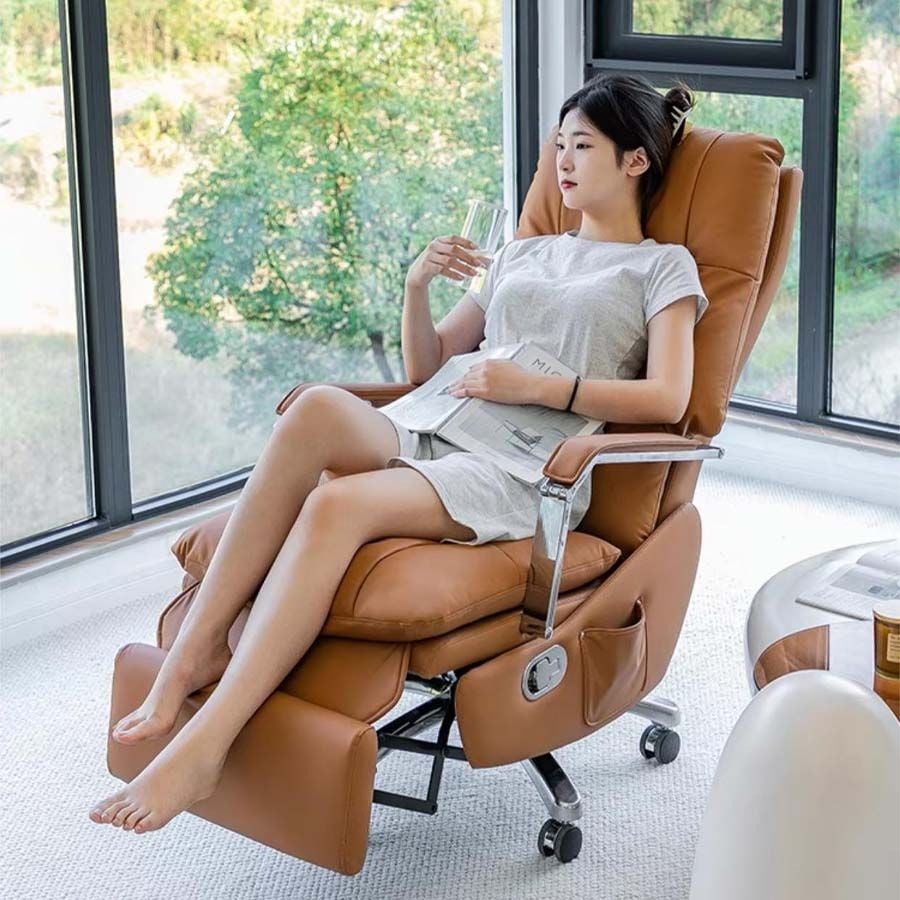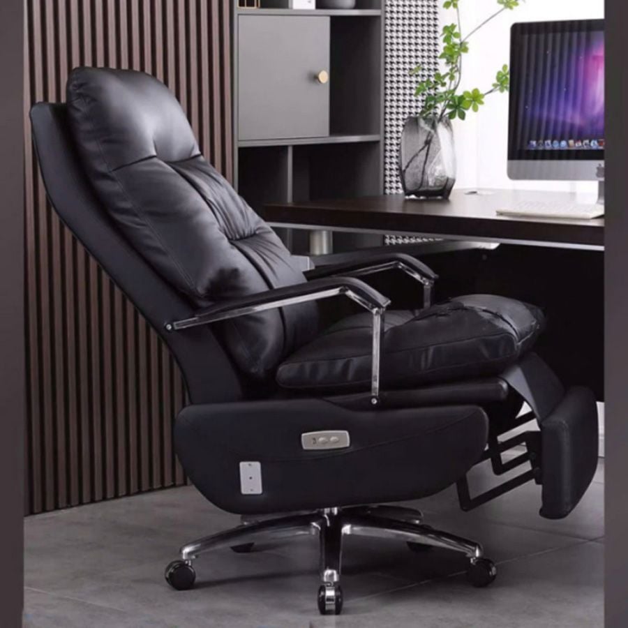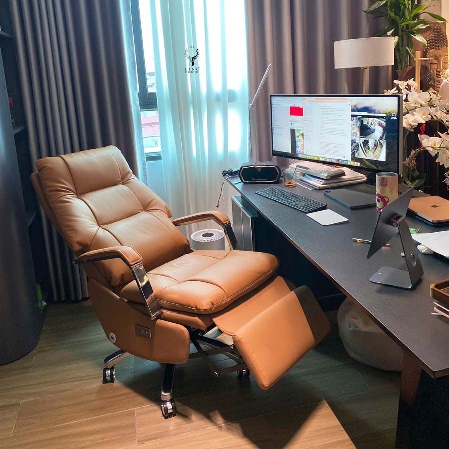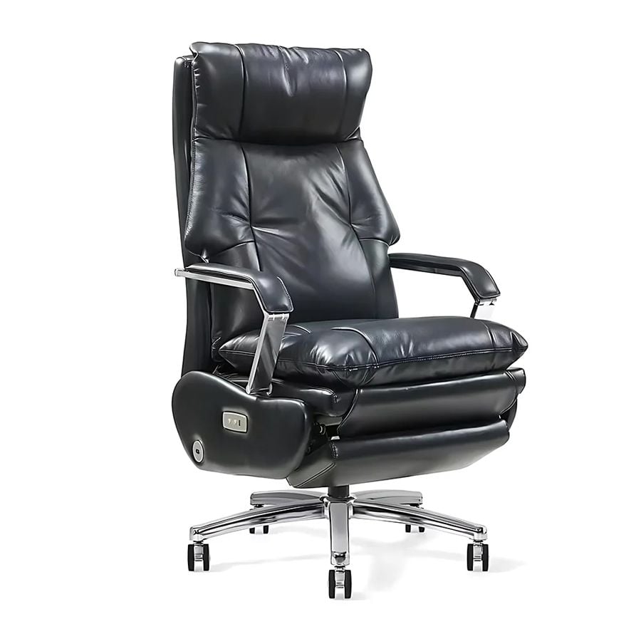 Toàn bộ phần tựa và đệm ghế được bọc da bò thật cao cấp, tạo cảm giác mềm mại, thoáng khí và cực kỳ bền bỉ. Mẫu ghế giám đốc TKT12 sở hữu các đường may nổi tinh tế, form dáng ôm trọn cơ thể giúp giảm áp lực lên cột sống, mang lại sự thoải mái tối đa khi làm việc lâu dài. Đặc biệt, ghế giám đốc màu nâu TKT12 sở hữu chức năng chỉnh điện giúp điều chỉnh góc ngả dễ dàng, tăng trải nghiệm tiện nghi cho người sử dụng.