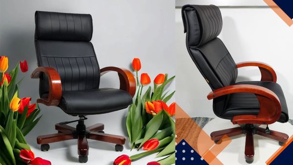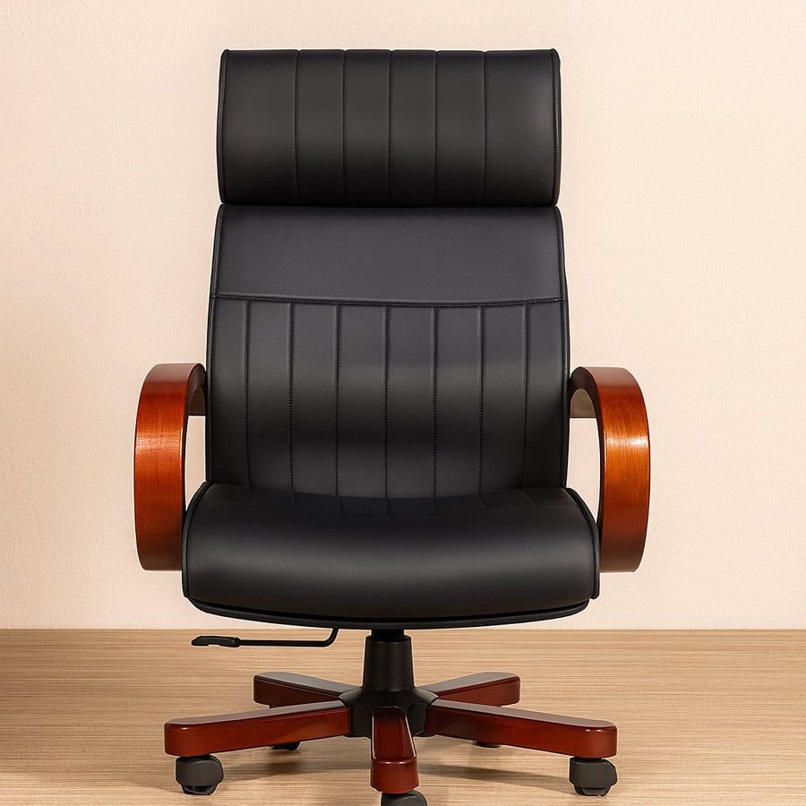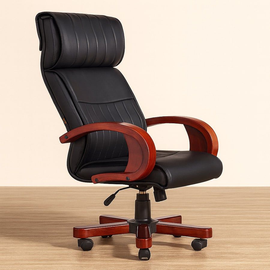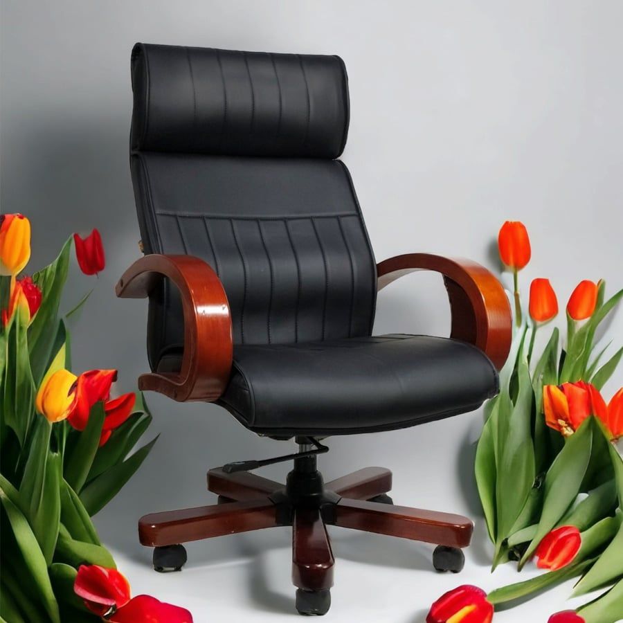 Chất liệu: Ghế văn phòng lưng cao liền gối bọc PU, tay ghế uốn cong gỗ tự nhiên, mâm ngả 2 cần, chân xoay gỗ cao cấp.