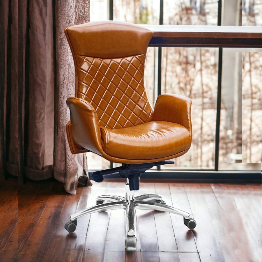 Chất liệu: Ghế văn phòng lưng cao liền gối bọc PU, tay ghế uốn cong mềm mại, mâm ngả 2 cần, chân xoay nhôm.