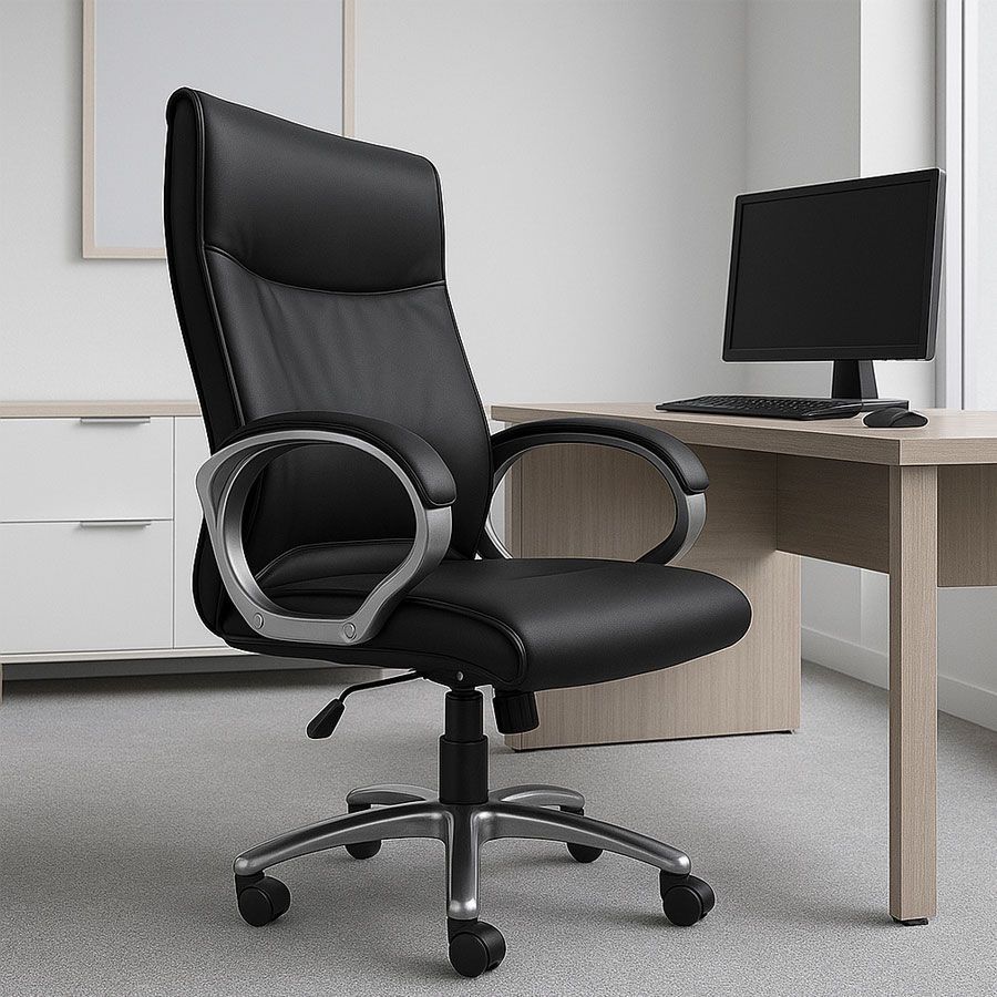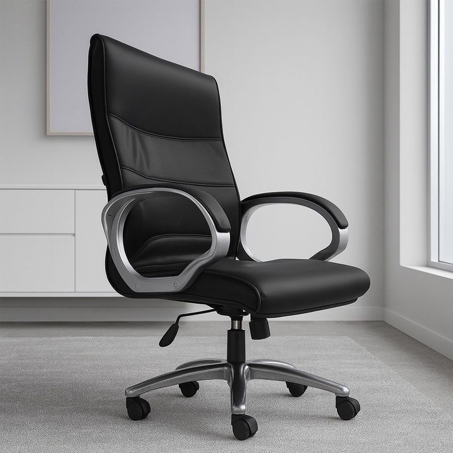 Chất liệu: Tựa lưng: Bọc da cao cấp, Nệm ghế: Bọc vinyl bền bỉ, Tay ghế: khung kim loại chắc chắn, Chân ghế: Thép mạ crom tiêu chuẩn BIFMA 85C, chịu tải trọng lên đến 100kg. Đường kính vòng chân: 700mm, đảm bảo sự vững chãi khi ngả lưng.