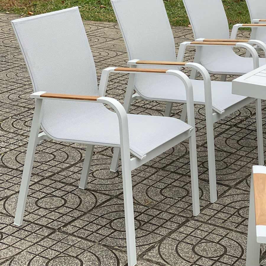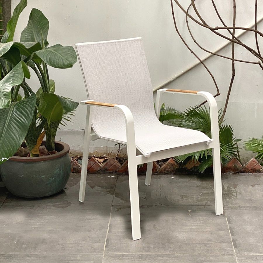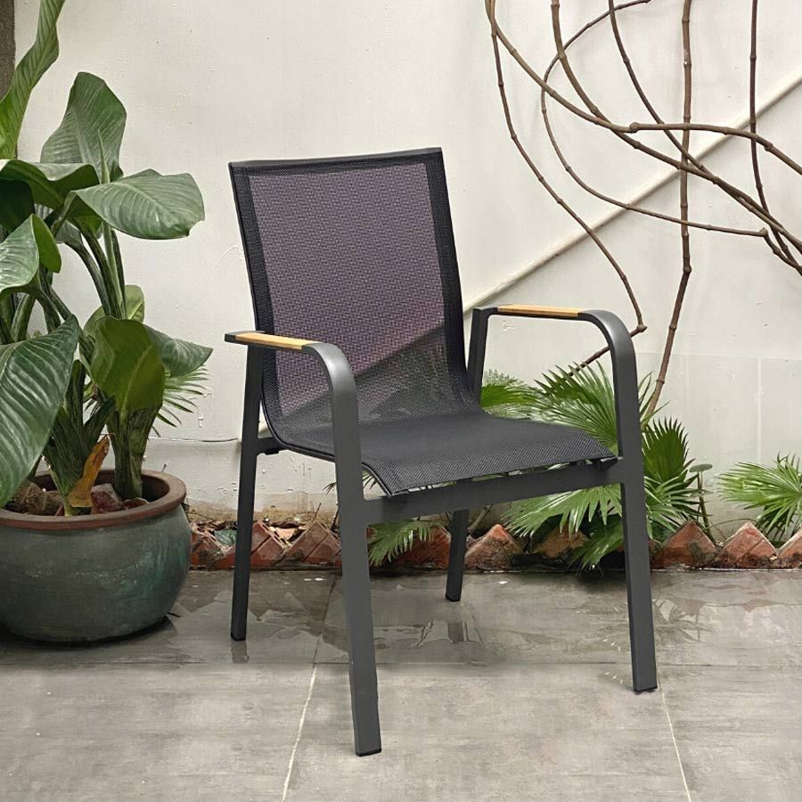 Chất liệu: Khung ghế nhôm đúc chống gỉ, Lưng và đế ngồi bằng lưới Textilene thoáng mát, Tay vịn nan gỗ Teak hoặc tay vịn composite giả gỗ