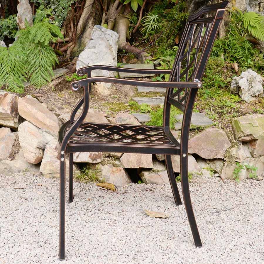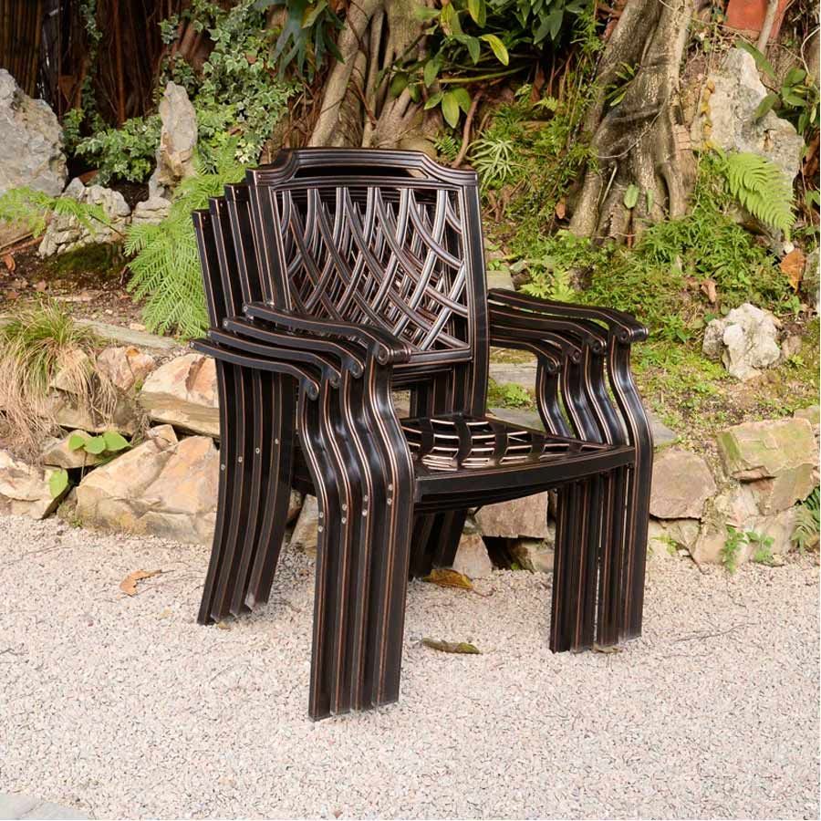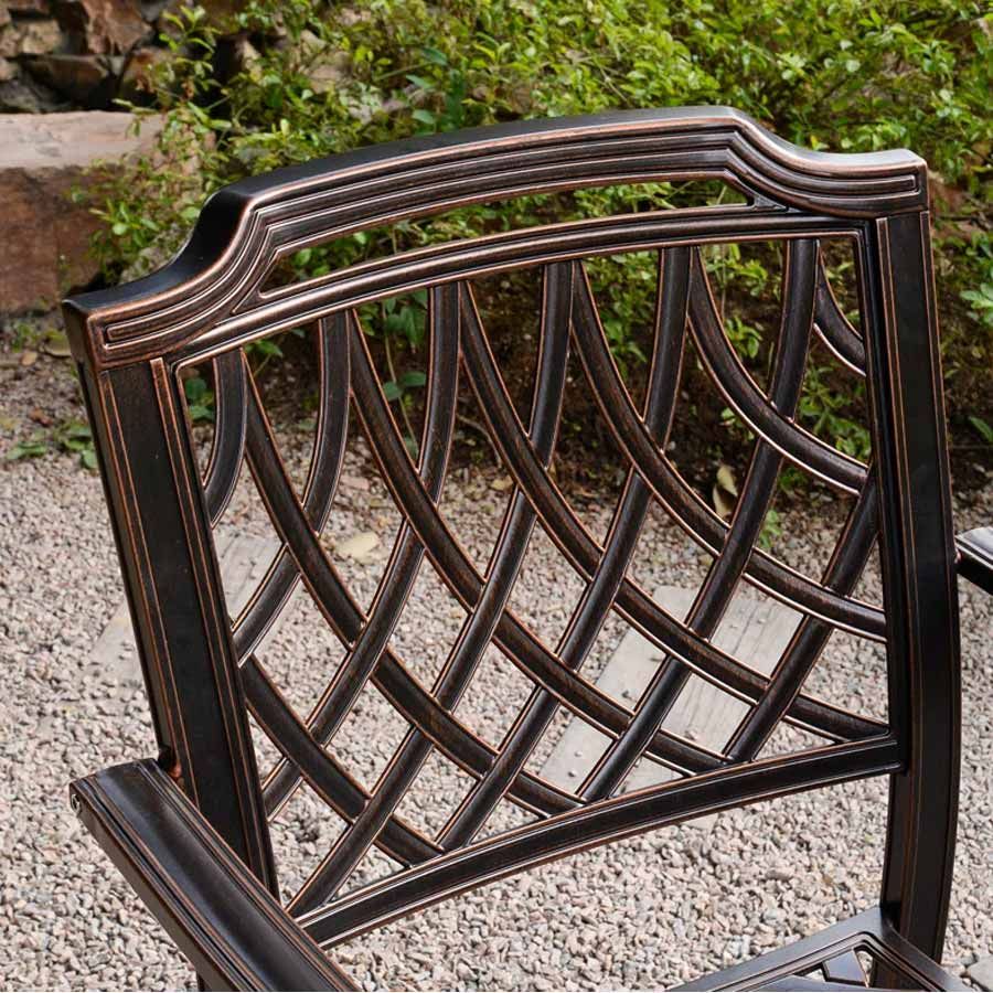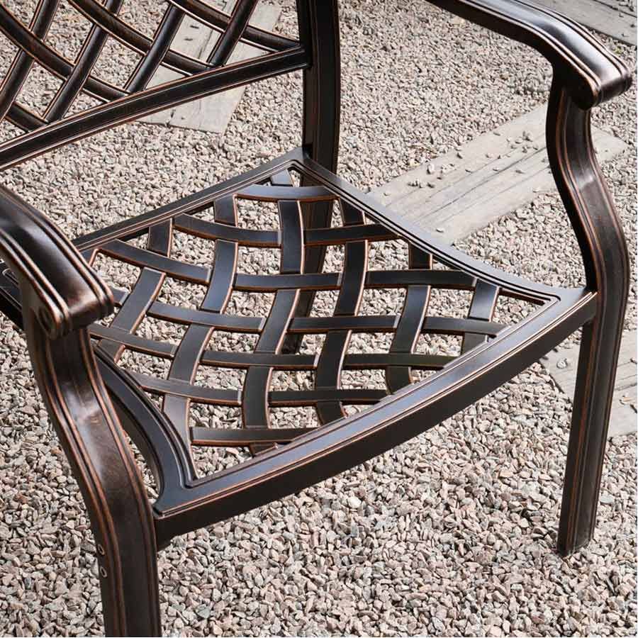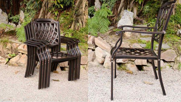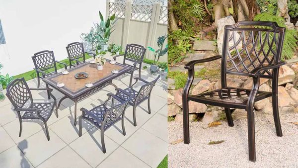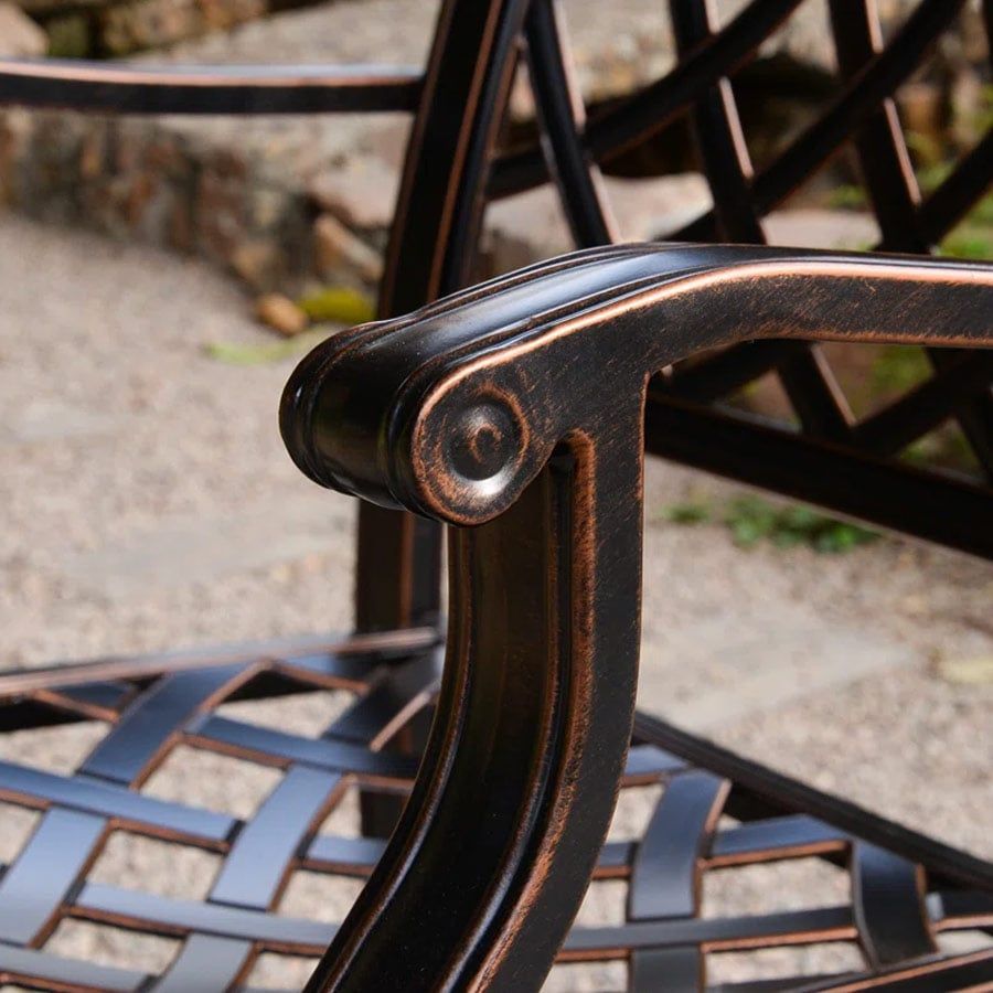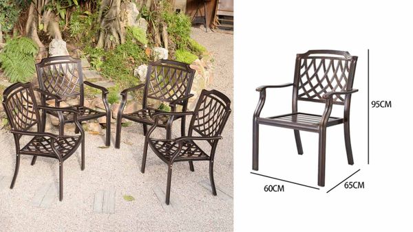 - Chất liệu nhôm đúc sơn tĩnh điện: Ghế được làm từ nhôm đúc chắc chắn, phủ lớp sơn tĩnh điện, giúp bảo vệ chống lại oxi hóa và độ bền vượt trội khi sử dụng ngoài trời.