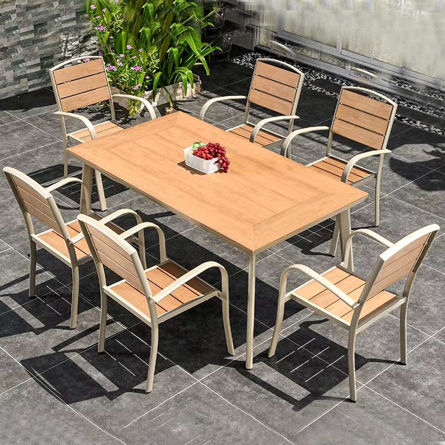 Mặt ghế và tựa lưng làm từ nan Polywood giả gỗ, tái hiện vẻ đẹp ấm áp của gỗ tự nhiên nhưng khắc phục được nhược điểm cong vênh, mối mọt và không cần bảo dưỡng thường xuyên. Nhờ sự kết hợp hài hòa giữa kim loại và vật liệu giả gỗ, mẫu ghế này đặc biệt phù hợp cho sân vườn, ban công, khu nghỉ dưỡng hay không gian quán cafe ngoài trời.